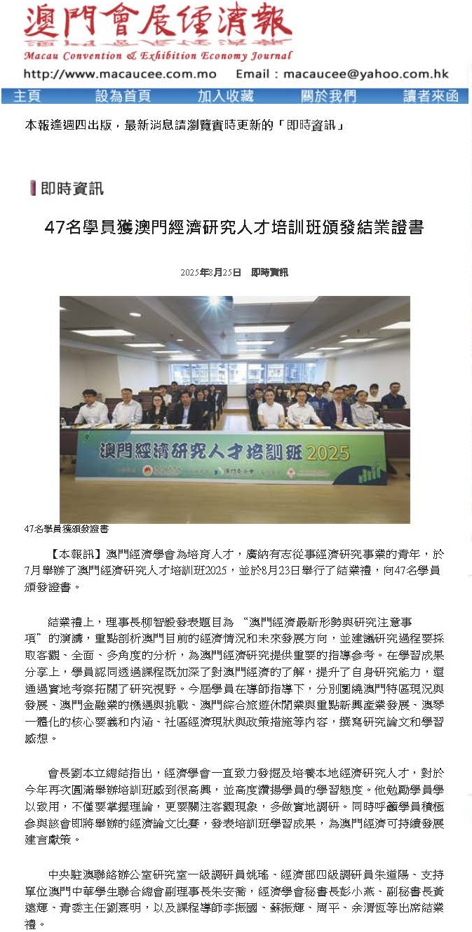 【本報訊】澳門經濟學會為培育人才,廣納有志從事經濟研究事業的青年,於7月舉辦了澳門經濟研究人才培訓班2025,並於8月23日舉行了結業禮,向47名學員頒發證書。 結業禮上,理事長柳智毅發表題目為 “澳門經濟最新形勢與研究注意事項”的演講,重點剖析澳門目前的經濟情況和未來發展方向,並建議研究過程要採取客觀、全面、多角度的分析,為澳門經濟研究提供重要的指導參考。在學習成果分享上,學員認同透過課程既加深了對澳門經濟的了解,提升了自身研究能力,還通過實地考察拓闊了研究視野。今屆學員在導師指導下,分別圍繞澳門特區現況與發展、澳門金融業的機遇與挑戰、澳門綜合旅遊休閒業與重點新興產業發展、澳琴一體化的核心要義和內涵、社區經濟現狀與政策措施等內容,撰寫研究論文和學習感想。 會長劉本立總結指出,經濟學會一直致力發掘及培養本地經濟研究人才,對於今年再次圓滿舉辦培訓班感到很高興,並高度讚揚學員的學習態度。他勉勵學員學以致用,不僅要掌握理論,更要關注客觀現象,多做實地調研。同時呼籲學員積極參與該會即將舉辦的經濟論文比賽,發表培訓班學習成果,為澳門經濟可持續發展建言獻策。 中央駐澳聯絡辦公室研究室一級調研員姚瑤、經濟部四級調研員朱道陽、支持單位澳門中華學生聯合總會副理事長朱安喬,經濟學會秘書長彭小燕、副秘書長黃遠輝、青委主任劉熹明,以及課程導師李振國、蘇振輝、周平、余渭恆等出席結業禮。 新聞來源:澳門會展經濟報 ![]() |