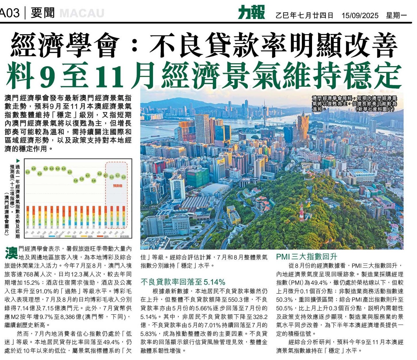 澳門經濟學會發布最新澳門經濟景氣指數走勢,預料9月至11月本澳經濟景氣指數整體維持「穩定」級別,又指短期內澳門經濟景氣將以復甦為主,但增長節奏可能較為溫和,需持續關注國際和區域經濟形勢,以及政策支持對本地經濟的穩定作用。 澳門經濟學會表示,暑假旅遊旺季帶動大量內地及周邊地區旅客入境,為本地博彩及綜合旅遊休閒業注入活力。今年7月至8月,澳門入境旅客達768萬人次,日均12.3萬人次,較去年同期增加15.2%;酒店住宿需求強勁,酒店及公寓入住率升至91.0%的「過熱」等級水平。博彩毛收入表現理想,7月及8月的日均博彩毛收入分別錄得7.14億及7.15億澳門元。此外,7月貨幣供應M2按年增9.7%至8,386億(澳門幣,下同),繼續創歷史新高。 然而,7月內地消費者信心指數仍處於「低迷」等級。本地居民貸存比率回落至49.4%,仍處於近10年以來的低位,屬景氣指標體系的「欠佳」等級。經綜合評估計算,7月和8月整體景氣指數分別維持「穩定」水平。 詳閱: 力報。 |