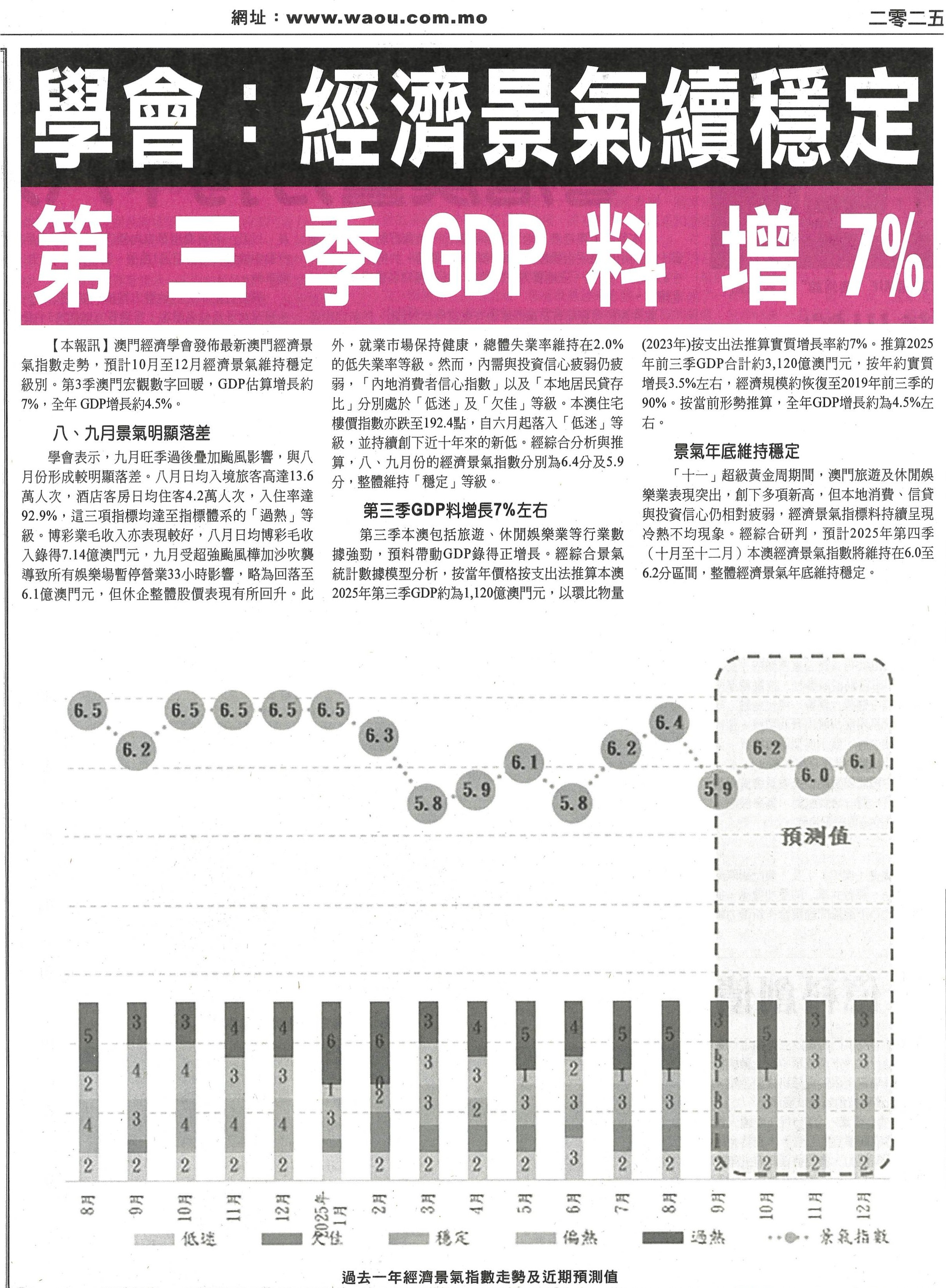 | 【本報訊】澳門經濟學會發佈最新澳門經濟景氣指數走勢,預計10月至12月經濟景氣維持穩定級別。第3季澳門宏觀數字回暖,GDP估算增長約7%,全年 GDP增長約4.5%。 八、九月景氣明顯落差 學會表示,九月旺季過後疊加颱風影響,與八月份形成較明顯落差。八月日均入境旅客高達13.6萬人次,酒店客房日均住客4.2萬人次,入住率達92.9%,這三項指標均達至指標體系的「過熱」等級。博彩業毛收入亦表現較好,八月日均博彩毛收入錄得7.14億澳門元,九月受超強颱風樺加沙吹襲導致所有娛樂場暫停營業33小時影響,略為回落至6.1億澳門元,但休企整體股價表現有所回升。此外,就業市場保持健康,總體失業率維持在2.0%的低失業率等級。然而,內需與投資信心疲弱仍疲弱,「內地消費者信心指數」以及「本地居民貸存比」分別處於「低迷」及「欠佳」等級。本澳住宅樓價指數亦跌至192.4點,自六月起落入「低迷」等級,並持續創下近十年來的新低。經綜合分析與推算,八、九月份的經濟景氣指數分別為6.4分及5.9分,整體維持「穩定」等級。 第三季GDP料增長7%左右 第三季本澳包括旅遊、休閒娛樂業等行業數據強勁,預料帶動GDP錄得正增長。經綜合景氣統計數據模型分析,按當年價格按支出法推算本澳2025年第三季GDP約為1,120億澳門元,以環比物量(2023年)按支出法推算實質增長率約7%。推算2025年前三季GDP合計約3,120億澳門元,按年約實質增長3.5%左右,經濟規模約恢復至2019年前三季的90%。按當前形勢推算,全年GDP增長約為4.5%左右。 景氣年底維持穩定 「十一」超級黃金周期間,澳門旅遊及休閒娛樂業表現突出,創下多項新高,但本地消費、信貸與投資信心仍相對疲弱,經濟景氣指標料持續呈現冷熱不均現象。經綜合研判,預計2025年第四季(十月至十二月)本澳經濟景氣指數將維持在6.0至6.2分區間,整體經濟景氣年底維持穩定。 詳閱: 新華澳報。 |