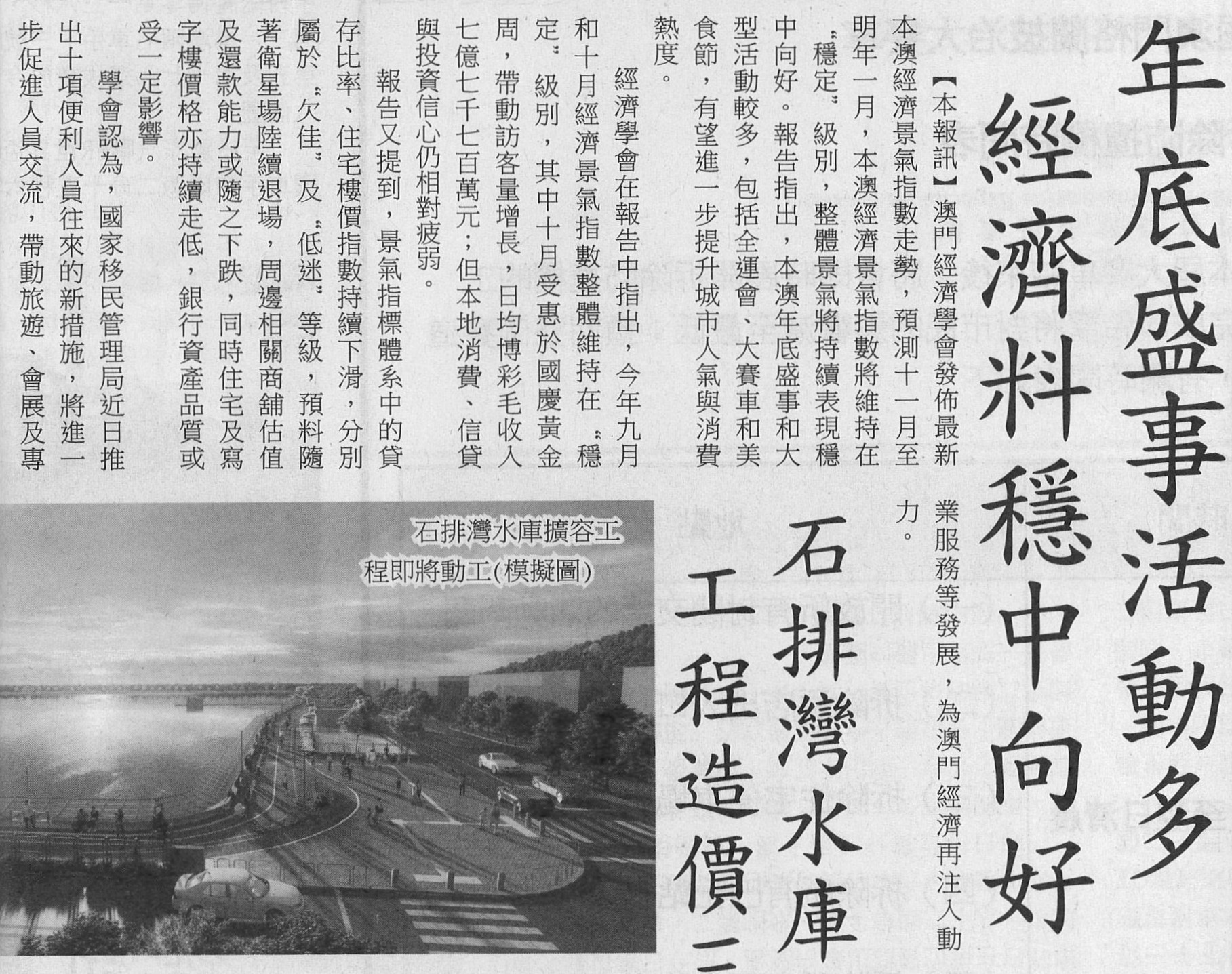 | 年底盛事活動多 經濟料穩中向好 【本報訊】澳門經濟學會發佈最新本澳經濟景氣指數走勢,預測十一月至明年一月,本澳經濟景氣指數將維持在“穩定”級別,整體景氣將持續表現穩中向好。報告指出,本澳年底盛事和大型活動較多,包括全運會、大賽車和美食節,有望進一步提升城市人氣與消費熱度。 經濟學會在報告中指出,今年九月和十月經濟景氣指數整體維持在“穩定”級別,其中十月受惠於國慶黃金周,帶動訪客量增長,日均博彩毛收入七億七千七百萬元;但本地消費、信貸與投資信心仍相對疲弱。 報告又提到,景氣指標體系中的貸存比率、住宅樓價指數持續下滑,分別屬於“欠佳”及“低迷”等級,預料隨著衛星場陸續退場,周邊相關商舖估值及還款能力或隨之下跌,同時住宅及寫字樓價格亦持續走低,銀行資產品質或受一定影響。 學會認為,國家移民管理局近日推出十項便利人員往來的新措施,將進一步促進人員交流,帶動旅遊、會展及專業服務等發展,為澳門經濟再注入動力。 詳閱: 現代澳門日報。 |