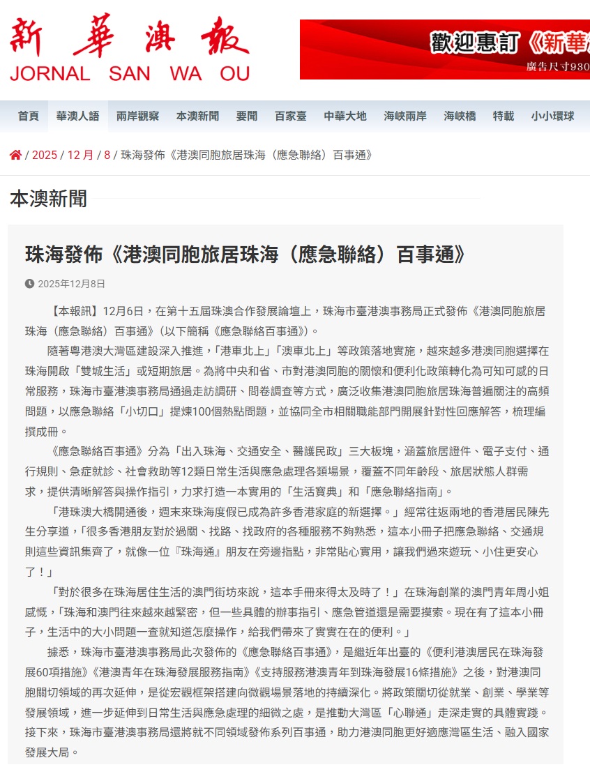 | 珠海發佈《港澳同胞旅居珠海(應急聯絡)百事通》 |