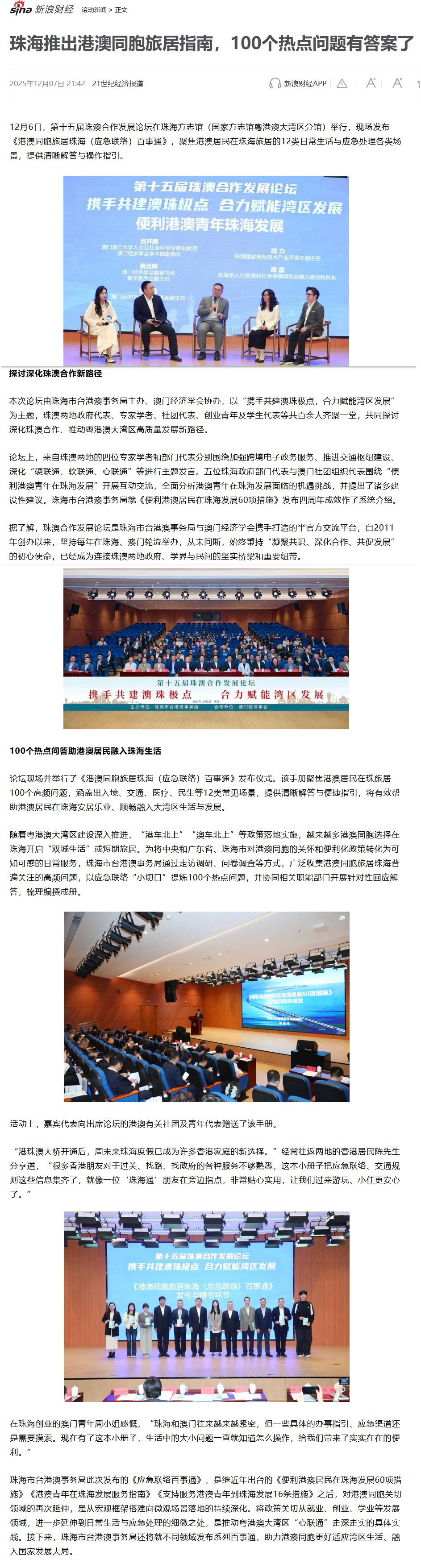| 12月6日,第十五届珠澳合作发展论坛在珠海方志馆(国家方志馆粤港澳大湾区分馆)举行,现场发布《港澳同胞旅居珠海(应急联络)百事通》,聚焦港澳居民在珠海旅居的12类日常生活与应急处理各类场景,提供清晰解答与操作指引。 探讨深化珠澳合作新路径 本次论坛由珠海市台港澳事务局主办、澳门经济学会协办,以“携手共建澳珠极点,合力赋能湾区发展”为主题,珠澳两地政府代表、专家学者、社团代表、创业青年及学生代表等共百余人齐聚一堂,共同探讨深化珠澳合作、推动粤港澳大湾区高质量发展新路径。 论坛上,来自珠澳两地的四位专家学者和部门代表分别围绕加强跨境电子政务服务、推进交通枢纽建设、深化“硬联通、软联通、心联通”等进行主题发言。五位珠海政府部门代表与澳门社团组织代表围绕“便利港澳青年在珠海发展”开展互动交流,全面分析港澳青年在珠海发展面临的机遇挑战,并提出了诸多建设性建议。珠海市台港澳事务局就《便利港澳居民在珠海发展60项措施》发布四周年成效作了系统介绍。 据了解,珠澳合作发展论坛是珠海市台港澳事务局与澳门经济学会携手打造的半官方交流平台,自2011年创办以来,坚持每年在珠海、澳门轮流举办,从未间断,始终秉持“凝聚共识、深化合作、共促发展”的初心使命,已经成为连接珠澳两地政府、学界与民间的坚实桥梁和重要纽带。 论坛现场并举行了《港澳同胞旅居珠海(应急联络)百事通》发布仪式。该手册聚焦港澳居民在珠旅居100个高频问题,涵盖出入境、交通、医疗、民生等12类常见场景,提供清晰解答与便捷指引,将有效帮助港澳居民在珠海安居乐业、顺畅融入大湾区生活与发展。 随着粤港澳大湾区建设深入推进,“港车北上”“澳车北上”等政策落地实施,越来越多港澳同胞选择在珠海开启“双城生活”或短期旅居。为将中央和广东省、珠海市对港澳同胞的关怀和便利化政策转化为可知可感的日常服务,珠海市台港澳事务局通过走访调研、问卷调查等方式,广泛收集港澳同胞旅居珠海普遍关注的高频问题,以应急联络“小切口”提炼100个热点问题,并协同相关职能部门开展针对性回应解答,梳理编撰成册。 “港珠澳大桥开通后,周末来珠海度假已成为许多香港家庭的新选择。”经常往返两地的香港居民陈先生分享道,“很多香港朋友对于过关、找路、找政府的各种服务不够熟悉,这本小册子把应急联络、交通规则这些信息集齐了,就像一位‘珠海通’朋友在旁边指点,非常贴心实用,让我们过来游玩、小住更安心了。” 在珠海创业的澳门青年周小姐感慨,“珠海和澳门往来越来越紧密,但一些具体的办事指引、应急渠道还是需要摸索。现在有了这本小册子,生活中的大小问题一查就知道怎么操作,给我们带来了实实在在的便利。” 珠海市台港澳事务局此次发布的《应急联络百事通》,是继近年出台的《便利港澳居民在珠海发展60项措施》《港澳青年在珠海发展服务指南》《支持服务港澳青年到珠海发展16条措施》之后,对港澳同胞关切领域的再次延伸,是从宏观框架搭建向微观场景落地的持续深化。将政策关切从就业、创业、学业等发展领域,进一步延伸到日常生活与应急处理的细微之处,是推动粤港澳大湾区“心联通”走深走实的具体实践。接下来,珠海市台港澳事务局还将就不同领域发布系列百事通,助力港澳同胞更好适应湾区生活、融入国家发展大局。 詳閱: 新浪财经。 |