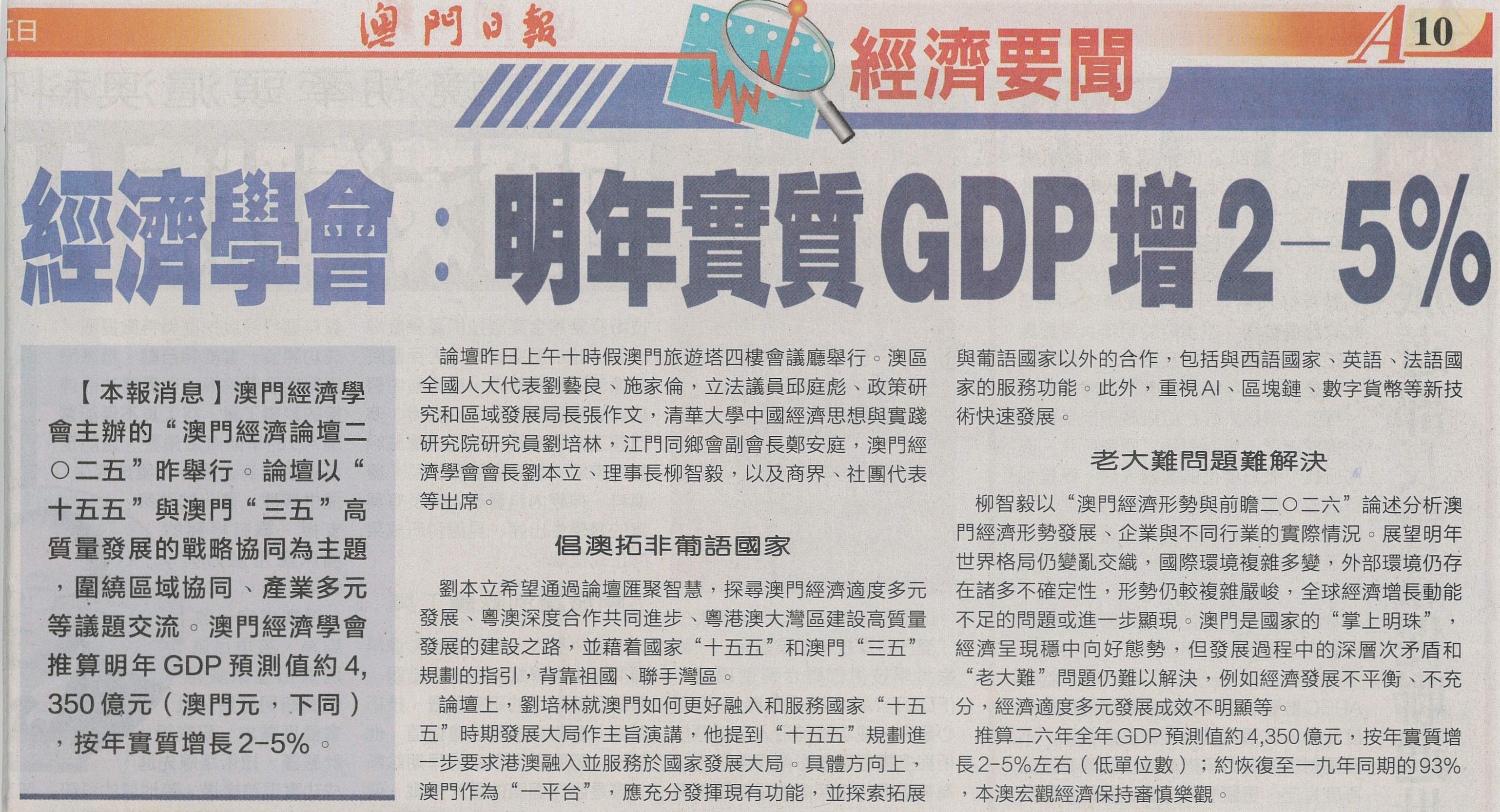 | 經濟學會:明年實質GDP增2-5% 【本報消息】澳門經濟學會主辦的“澳門經濟論壇二○二五”昨舉行。論壇以“十五五”與澳門“三五”高質量發展的戰略協同為主題,圍繞區域協同、產業多元等議題交流。澳門經濟學會推算明年GDP預測值約4,350億元(澳門元,下同),按年實質增長2-5%。 論壇昨日上午十時假澳門旅遊塔四樓會議廳舉行。澳區全國人大代表劉藝良、施家倫,立法議員邱庭彪、政策研究和區域發展局長張作文,清華大學中國經濟思想與實踐研究院研究員劉培林,江門同鄉會副會長鄭安庭,澳門經濟學會會長劉本立、理事長柳智毅,以及商界、社團代表等出席。 倡澳拓非葡語國家 劉本立希望通過論壇匯聚智慧,探尋澳門經濟適度多元發展、粵澳深度合作共同進步、粵港澳大灣區建設高質量發展的建設之路,並藉着國家“十五五”和澳門“三五”規劃的指引,背靠祖國、聯手灣區。 論壇上,劉培林就澳門如何更好融入和服務國家“十五五”時期發展大局作主旨演講,他提到“十五五”規劃進一步要求港澳融入並服務於國家發展大局。具體方向上,澳門作為“一平台”,應充分發揮現有功能,並探索拓展與葡語國家以外的合作,包括與西語國家、英語、法語國家的服務功能。此外,重視AI、區塊鏈、數字貨幣等新技術快速發展。 老大難問題難解決 柳智毅以“澳門經濟形勢與前瞻二○二六”論述分析澳門經濟形勢發展、企業與不同行業的實際情況。展望明年世界格局仍變亂交織,國際環境複雜多變,外部環境仍存在諸多不確定性,形勢仍較複雜嚴峻,全球經濟增長動能不足的問題或進一步顯現。澳門是國家的“掌上明珠”,經濟呈現穩中向好態勢,但發展過程中的深層次矛盾和“老大難”問題仍難以解決,例如經濟發展不平衡、不充分,經濟適度多元發展成效不明顯等。 推算二六年全年GDP預測值約4,350億元,按年實質增長2-5%左右(低單位數);約恢復至一九年同期的93%,本澳宏觀經濟保持審慎樂觀。 詳閱: 澳門日報。 |
