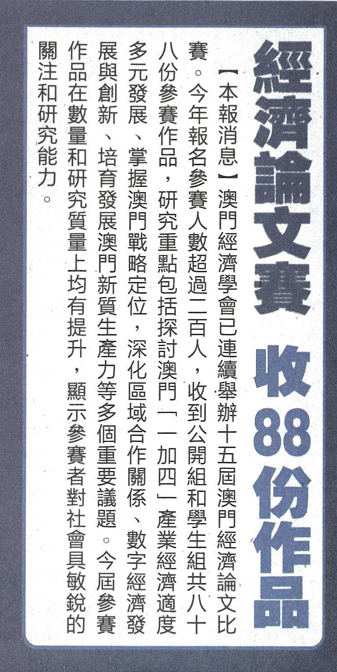 | 經濟論文賽 收88份作品 【本報消息】澳門經濟學會已連續舉辦十五屆澳門經濟論文比賽。今年報名參賽人數超過二百人,收到公開組和學生組共八十八份參賽作品,研究重點包括探討澳門“一加四”產業經濟適度多元發展、掌握澳門戰略定位,深化區域合作關係、數字經濟發展與創新、培育發展澳門新質生產力等多個重要議題。今屆參賽作品在數量和研究質量上均有提升,顯示參賽者對社會具敏銳的關注和研究能力。 詳閱: 澳門日報。 |