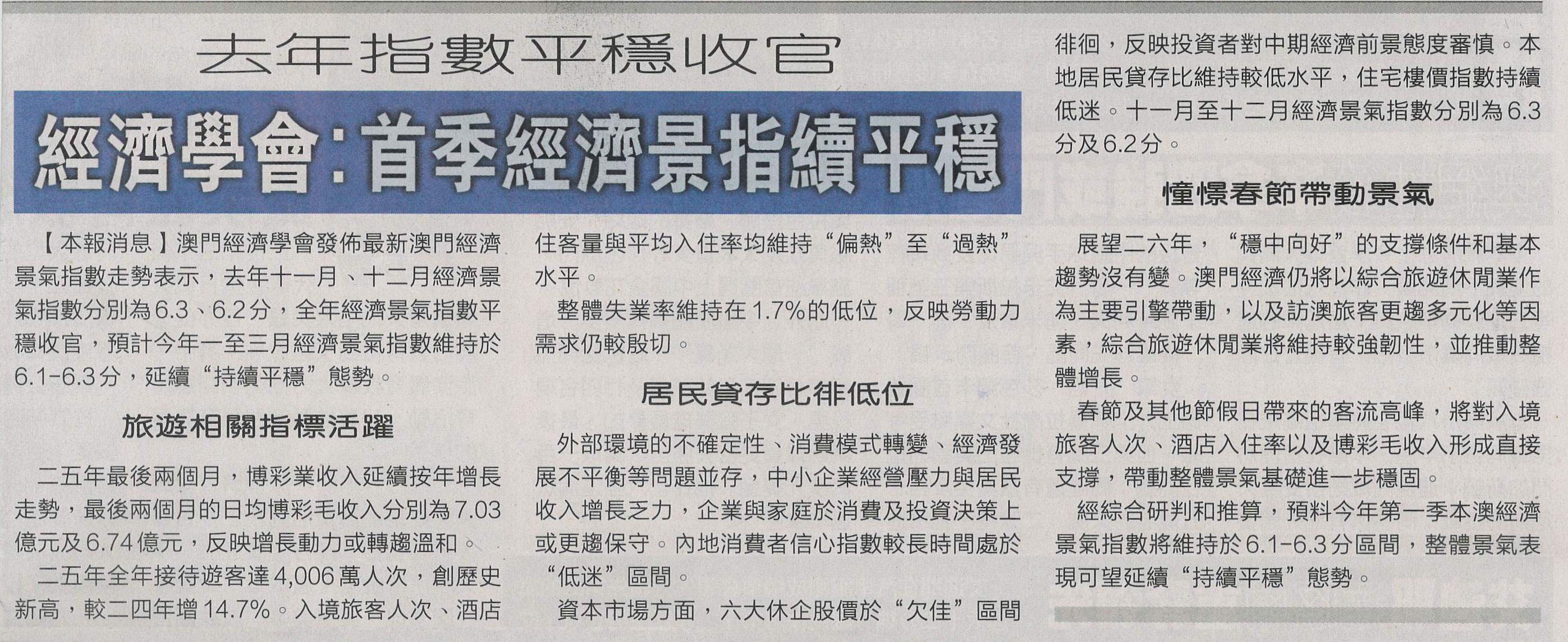 | 去年指數平穩收官 經濟學會:首季經濟景指續平穩 |