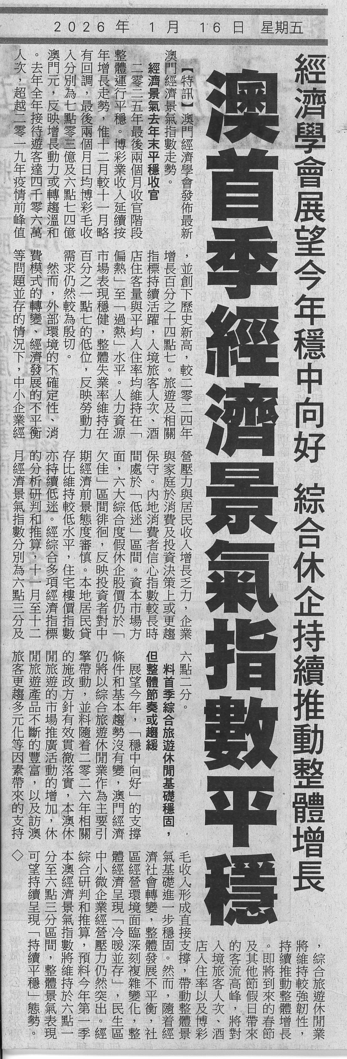 | 【特訊】澳門經濟學會發佈最新澳門經濟景氣指數走勢。 經濟景氣去年末平穩收官 二零二五年最後兩個月收官階段整體運行平穩。博彩業收入延續按年增長走勢,惟十二月較十一月略有回調,最後兩個月日均博彩毛收入分別為七點零三億及六點七四億澳門元,反映增長動力或轉趨溫和。去年全年接待遊客達四千零六萬人次,超越二零一九年疫情前峰值,並創下歷史新高,較二零二四年增長百分之十四點七。旅遊及相關指標持續活躍,入境旅客人次、酒店住客量與平均入住率均維持在「偏熱」至「過熱」水平。人力資源市場表現穩健,整體失業率維持在百分之一點七的低位,反映勞動力需求仍然較為殷切。 然而,外部環境的不確定性、消費模式的轉變、經濟發展的不平衡等問題並存的情況下,中小企業經營壓力與居民收入增長乏力,企業與家庭於消費及投資決策上或更趨保守。內地消費者信心指數較長時間處於「低迷」區間。資本市場方面,六大綜合度假休企股價仍於「欠佳」區間徘徊,反映投資者對中期經濟前景態度審慎。本地居民貸存比維持較低水平,住宅樓價指數亦持續低迷。經綜合多項經濟指標的分析研判和推算,十一月至十二月經濟景氣指數分別為六點三分及六點二分。 料首季綜合旅遊休閒基礎穩固,但整體節奏或趨緩 展望今年,「穩中向好」的支撐條件和基本趨勢沒有變,澳門經濟仍將以綜合旅遊休閒業作為主要引擎帶動,並料隨着二零二六年相關的施政方針有效貫徹落實,本澳休閒旅遊的市場推廣活動的增加,休閒旅遊產品不斷的豐富,以及訪澳旅客更趨多元化等因素帶來的支持,綜合旅遊休閒業將維持較強韌性,持續推動整體增長。即將到來的春節及其他節假日帶來的客流高峰,將對入境旅客人次、酒店入住率以及博彩毛收入形成直接支撐,帶動整體景氣基礎進一步穩固。然而,隨着經濟社會轉變,整體發展不平衡,社區經營環境面臨深刻複雜變化,整體經濟呈現「冷暖並存」,民生區中小微企業經營壓力仍然突出。經綜合研判和推算,預料今年第一季本澳經濟景氣指數將維持於六點一分至六點三分區間,整體景氣表現可望持續呈現「持續平穩」態勢。◇ 詳閱: 華僑報。 |