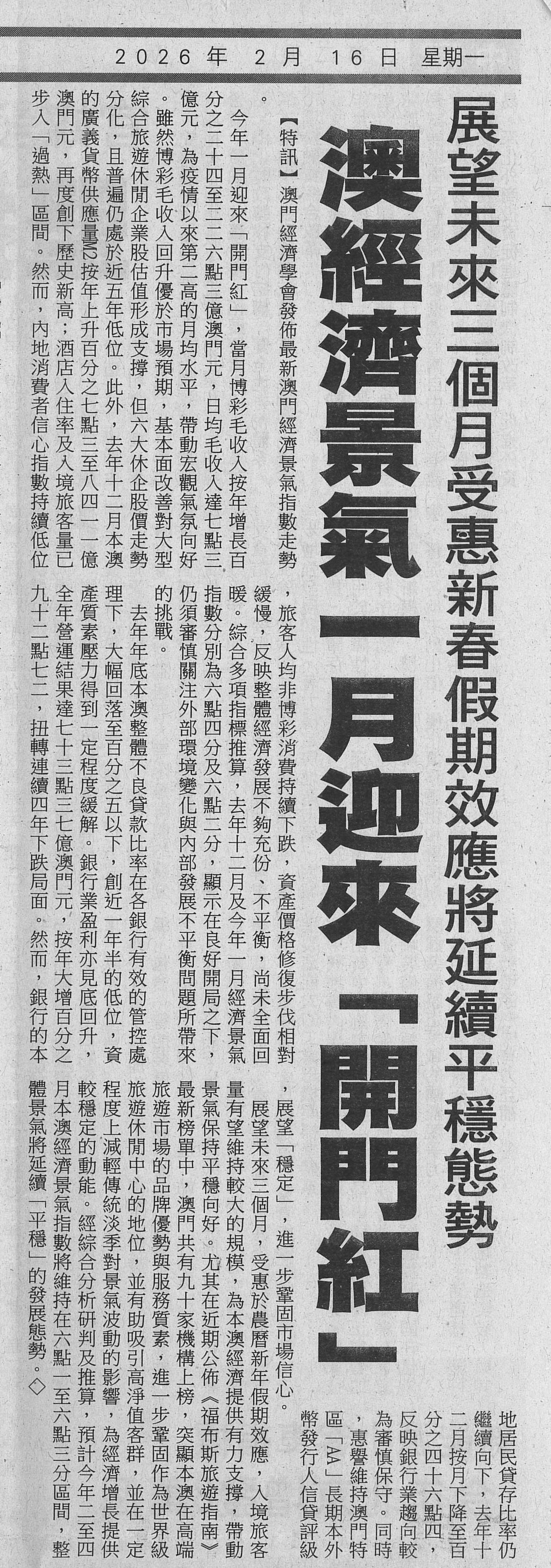 | 【特訊】澳門經濟學會發佈最新澳門經濟景氣指數走勢。 今年一月迎來「開門紅」,當月博彩毛收入按年增長百分之二十四至二二六點三億澳門元,日均毛收入達七點三億元,為疫情以來第二高的月均水平,帶動宏觀氣氛向好。雖然博彩毛收入回升優於市場預期,基本面改善對大型綜合旅遊休閒企業股估值形成支撐,但六大休企股價走勢分化,且普遍仍處於近五年低位。此外,去年十二月本澳的廣義貨幣供應量M2按年上升百分之七點三至八四一一億澳門元,再度創下歷史新高;酒店入住率及入境旅客量已步入「過熱」區間。然而,內地消費者信心指數持續低位,旅客人均非博彩消費持續下跌,資產價格修復步伐相對緩慢,反映整體經濟發展不夠充份、不平衡,尚未全面回暖。綜合多項指標推算,去年十二月及今年一月經濟景氣指數分別為六點四分及六點二分,顯示在良好開局之下,仍須審慎關注外部環境變化與內部發展不平衡問題所帶來的挑戰。 去年年底本澳整體不良貸款比率在各銀行有效的管控處理下,大幅回落至百分之五以下,創近一年半的低位,資產質素壓力得到一定程度緩解。銀行業盈利亦見底回升,全年營運結果達七十三點三七億澳門元,按年大增百分之九十二點七二,扭轉連續四年下跌局面。然而,銀行的本地居民貸存比率仍繼續向下,去年十二月按月下降至百分之四十六點四,反映銀行業趨向較為審慎保守。同時,惠譽維持澳門特區「AA」長期本外幣發行人信貸評級,展望「穩定」,進一步鞏固市場信心。 展望未來三個月,受惠於農曆新年假期效應,入境旅客量有望維持較大的規模,為本澳經濟提供有力支撐,帶動景氣保持平穩向好。尤其在近期公佈《福布斯旅遊指南》最新榜單中,澳門共有九十家機構上榜,突顯本澳在高端旅遊市場的品牌優勢與服務質素,進一步鞏固作為世界級旅遊休閒中心的地位,並有助吸引高淨值客群,並在一定程度上減輕傳統淡季對景氣波動的影響,為經濟增長提供較穩定的動能。經綜合分析研判及推算,預計今年二至四月本澳經濟景氣指數將維持在六點一至六點三分區間,整體景氣將延續「平穩」的發展態勢。◇ 詳閱: 華僑報。 |