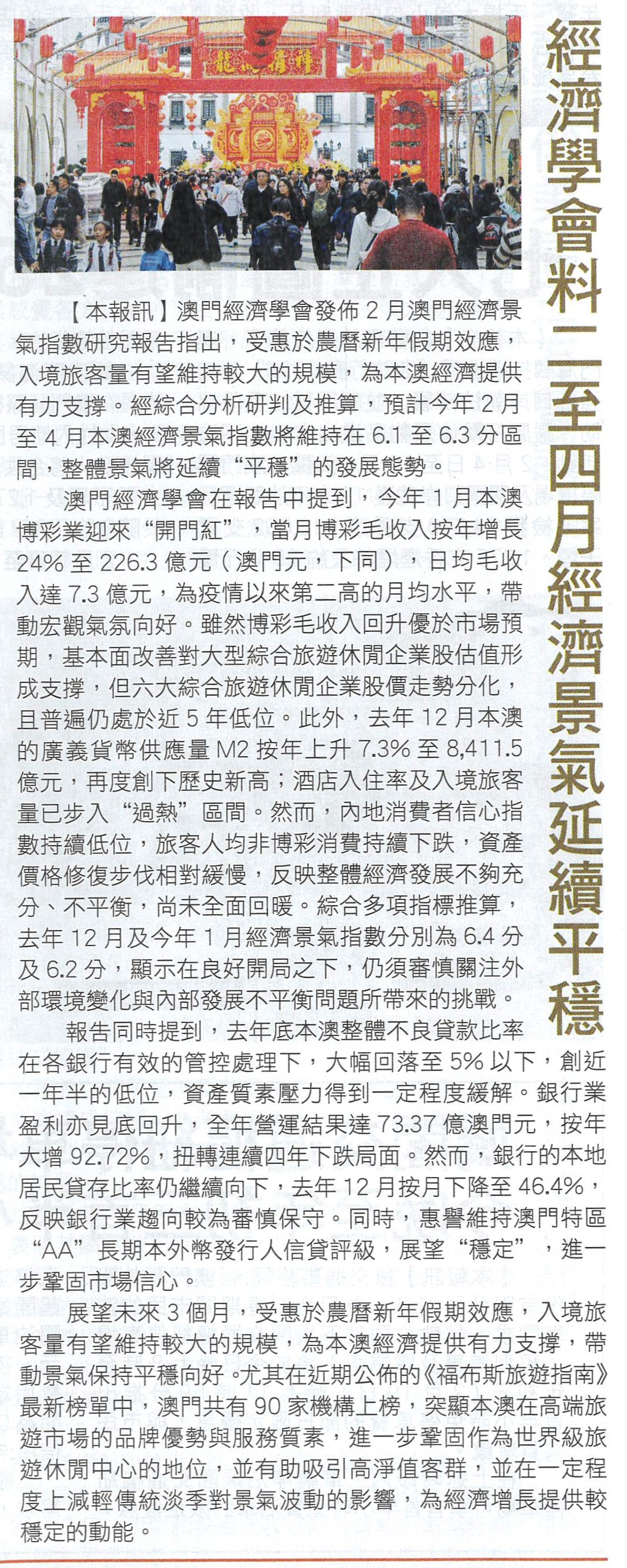 | 【本報訊】澳門經濟學會發佈2月澳門經濟景氣指數研究報告指出,受惠於農曆新年假期效應,入境旅客量有望維持較大的規模,為本澳經濟提供有力支撐。經綜合分析研判及推算,預計今年2月至4月本澳經濟景氣指數將維持在6.1至6.3分區間,整體景氣將延續“平穩”的發展態勢。 澳門經濟學會在報告中提到,今年1月本澳博彩業迎來“開門紅”,當月博彩毛收入按年增長24%至226.3億元(澳門元,下同),日均毛收入達7.3億元,為疫情以來第二高的月均水平,帶動宏觀氣氛向好。雖然博彩毛收入回升優於市場預期,基本面改善對大型綜合旅遊休閒企業股估值形成支撐,但六大綜合旅遊休閒企業股價走勢分化,且普遍仍處於近5年低位。此外,去年12月本澳的廣義貨幣供應量M2按年上升7.3%至8,411.5億元,再度創下歷史新高;酒店入住率及入境旅客量已步入“過熱”區間。然而,內地消費者信心指數持續低位,旅客人均非博彩消費持續下跌,資產價格修復步伐相對緩慢,反映整體經濟發展不夠充分、不平衡,尚未全面回暖。綜合多項指標推算,去年12月及今年1月經濟景氣指數分別為6.4分及6.2分,顯示在良好開局之下,仍須審慎關注外部環境變化與內部發展不平衡問題所帶來的挑戰。 報告同時提到,去年底本澳整體不良貸款比率在各銀行有效的管控處理下,大幅回落至5%以下,創近一年半的低位,資產質素壓力得到一定程度緩解。銀行業盈利亦見底回升,全年營運結果達73.37億澳門元,按年大增92.72%,扭轉連續四年下跌局面。然而,銀行的本地居民貸存比率仍繼續向下,去年12月按月下降至46.4%,反映銀行業趨向較為審慎保守。同時,惠譽維持澳門特區“AA”長期本外幣發行人信貸評級,展望“穩定”,進一步鞏固市場信心。 展望未來3個月,受惠於農曆新年假期效應,入境旅客量有望維持較大的規模,為本澳經濟提供有力支撐,帶動景氣保持平穩向好。尤其在近期公佈的《福布斯旅遊指南》最新榜單中,澳門共有90家機構上榜,突顯本澳在高端旅遊市場的品牌優勢與服務質素,進一步鞏固作為世界級旅遊休閒中心的地位,並有助吸引高淨值客群,並在一定程度上減輕傳統淡季對景氣波動的影響,為經濟增長提供較穩定的動能。 詳閱: 澳門時報。 |