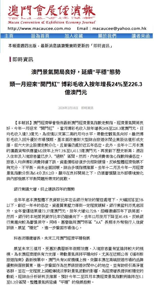 | 【本報訊】澳門經濟學會發佈最新澳門經濟景氣指數走勢指,經濟景氣開局良好,今年一月迎來“開門紅”,當月博彩毛收入按年增長24%至226.3億澳門元,日均毛收入達7.3億元,為疫情以來第二高的月均水平,帶動宏觀氣氛向好。雖然博彩毛收入回升優於市場預期,基本面改善對大型綜合旅遊休閒企業股估值形成支撐,但六大休企股價走勢分化,且普遍仍處於近五年低位。此外,去年十二月本澳的廣義貨幣供應量M2按年上升7.3%至8,411.5億澳門元,再度創下歷史新高;酒店入住率及入境旅客量已步入“過熱”區間。然而,內地消費者信心指數持續低位,旅客人均非博彩消費持續下跌,資產價格修復步伐相對緩慢,反映整體經濟發展不夠充分、不平衡,尚未全面回暖。綜合多項指標推算,去年十二月及今年一月經濟景氣指數分別為6.4分及6.2分,顯示在良好開局之下,仍須審慎關注外部環境變化與內部發展不平衡問題所帶來的挑戰。 銀行業績大增,終止連跌四年的頹勢 去年年底本澳整體不良貸款比率在各銀行有效的管控處理下,大幅回落至5%以下,創近一年半的低位,資產質素壓力得到一定程度緩解。銀行業盈利亦見底回升,全年營運結果達73.37億澳門元,按年大增92.72%,扭轉連續四年下跌局面。然而,銀行的本地居民貸存比率仍繼續向下,去年12月按月下降至46.4%,反映銀行業趨向較為審慎保守。同時,惠譽維持澳門特區“AA”長期本外幣發行人信貸評級,展望“穩定”,進一步鞏固市場信心。 料客流穩健增長,未來三月澳門經濟平穩發展 展望未來三個月,受惠於農曆新年假期效應,入境旅客量有望維持較大的規模,為本澳經濟提供有力支撐,帶動景氣保持平穩向好。尤其在近期公佈《福布斯旅遊指南》最新榜單中,澳門共有90家機構上榜,突顯本澳在高端旅遊市場的品牌優勢與服務質素,進一步鞏固作為世界級旅遊休閒中心的地位,並有助吸引高淨值客群,並在一定程度上減輕傳統淡季對景氣波動的影響,為經濟增長提供較穩定的動能。經綜合分析研判及推算,預計今年二至四月本澳經濟景氣指數將維持在6.1至6.3分區間,整體景氣將延續“平穩”的發展態勢。 詳閱: 澳門會展經濟報。 |