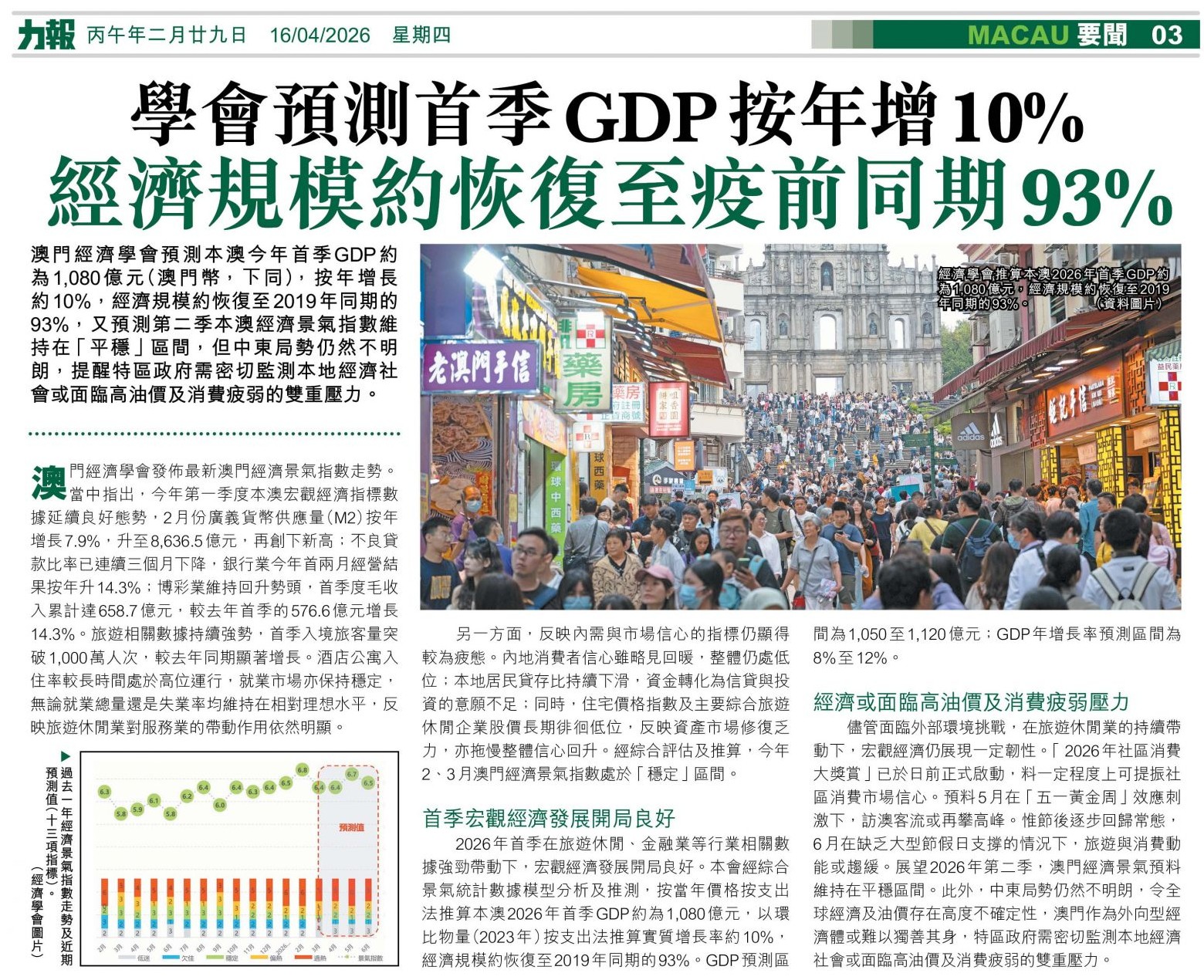 | 澳門經濟學會預測本澳今年首季GDP約為1,080億元(澳門幣,下同),按年增長約10%,經濟規模約恢復至2019年同期的93%,又預測第二季本澳經濟景氣指數維持在「平穩」區間,但中東局勢仍然不明朗,提醒特區政府需密切監測本地經濟社會或面臨高油價及消費疲弱的雙重壓力。 澳門經濟學會發佈最新澳門經濟景氣指數走勢。當中指出,今年第一季度本澳宏觀經濟指標數據延續良好態勢,2月份廣義貨幣供應量(M2)按年增長7.9%,升至8,636.5億元,再創下新高;不良貸款比率已連續三個月下降,銀行業今年首兩月經營結果按年升14.3%;博彩業維持回升勢頭,首季度毛收入累計達658.7億元,較去年首季的576.6億元增長14.3%。旅遊相關數據持續強勢,首季入境旅客量突破1,000萬人次,較去年同期顯著增長。酒店公寓入住率較長時間處於高位運行,就業市場亦保持穩定,無論就業總量還是失業率均維持在相對理想水平,反映旅遊休閒業對服務業的帶動作用依然明顯。 另一方面,反映內需與市場信心的指標仍顯得較為疲態。內地消費者信心雖略見回暖,整體仍處低位;本地居民貸存比持續下滑,資金轉化為信貸與投資的意願不足;同時,住宅價格指數及主要綜合旅遊休閒企業股價長期徘徊低位,反映資產市場修復乏力,亦拖慢整體信心回升。經綜合評估及推算,今年2、3月澳門經濟景氣指數處於「穩定」區間。 首季宏觀經濟發展開局良好 2026年首季在旅遊休閒、金融業等行業相關數據強勁帶動下,宏觀經濟發展開局良好。本會經綜合景氣統計數據模型分析及推測,按當年價格按支出法推算本澳2026年首季GDP約為1,080億元,以環比物量(2023年)按支出法推算實質增長率約10%,經濟規模約恢復至2019年同期的93%。GDP預測區間為1,050至1,120億元;GDP年增長率預測區間為8%至12%。 經濟或面臨高油價及消費疲弱壓力 儘管面臨外部環境挑戰,在旅遊休閒業的持續帶動下,宏觀經濟仍展現一定韌性。「2026年社區消費大獎賞」已於日前正式啟動,料一定程度上可提振社區消費市場信心。預料5月在「五一黃金周」效應刺激下,訪澳客流或再攀高峰。惟節後逐步回歸常態,6月在缺乏大型節假日支撐的情況下,旅遊與消費動能或趨緩。展望2026年第二季,澳門經濟景氣預料維持在平穩區間。此外,中東局勢仍然不明朗,令全球經濟及油價存在高度不確定性,澳門作為外向型經濟體或難以獨善其身,特區政府需密切監測本地經濟社會或面臨高油價及消費疲弱的雙重壓力。 詳閱: 力報。 |