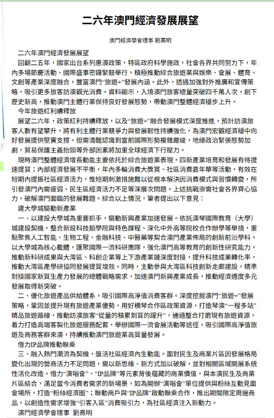 | 二六年澳門經濟發展展望 回顧二五年,國家出台系列惠澳政策,特區政府科學施政,社會各界共同努力下,年內多場節慶活動、國際盛事密鑼緊鼓舉行,積極推動綜合旅遊業與娛樂、會展、體育、文創等產業深度融合,豐富澳門“旅遊+”發展內涵。此外,透過加強對外推廣和宣傳策略,吸引更多旅客訪澳觀光消費。資料顯示,入境澳門旅客總量突破四千萬人次,創下歷史新高,推動澳門主體行業保持良好發展態勢,帶動澳門整體經濟穩步上升。 今年旅遊紅利續釋放 展望二六年,政策紅利持續釋放,以及“旅遊+”融合發展模式深度推進,預計訪澳旅客人數有望攀升,將有利主體行業競爭力與發展韌性持續強化,為澳門宏觀經濟穩中向好發展提供堅實支撐。但需清醒認識到當前國際形勢複雜嚴峻,地緣政治緊張態勢加劇,貿易保護主義抬頭等外部因素將加重全球經濟下行壓力。 現時澳門整體經濟增長動能主要依托於綜合旅遊業表現,四新產業培育和發展有待提速提質;內部經濟發展不平衡,年內多輪消費大獎賞、社區消費嘉年華等活動,有效在短期內提振社區經濟活力,惟短期刺激措施難以從根本解決因消費模式與習慣轉變,所引發澳門內需疲弱、民生區經濟活力不足等深層次問題。上述挑戰亟需社會各界齊心協力,破解澳門面臨的發展難題。綜合以上情況,筆者提出以下意見: 建大學城驅動新產業 一、以建設大學城為重要抓手,驅動新興產業加速發展。依託澳琴國際教育(大學)城建設契機,整合新設科技類學院與特色課程、深化中外高等院校合作辦學等舉措,重點聚焦人工智能、生物工程、金融科技、中醫藥等契合澳門產業佈局的創新前沿學科。以大學城為核心載體,匯聚國際一流科研團隊,強化澳門高等教育的創新性研究能力,推動新科研成果與大灣區、科創企業等上下游產業鏈深度對接,提升科技成果轉化率,推動大灣區產學研協同發展提質增效。同時,主動參與大灣區科技創新走廊建設,精準對接國家新質生產力發展的總體戰略需求,加速澳門新興產業成長,推動經濟適度多元發展取得新突破。 二、優化旅遊產品供給體系,吸引國際高淨值消費客群。深度挖掘澳門“旅遊+”發展策略,鞏固並提升現有旅遊產業優勢,用好橫琴合作區政策資源,打造琴澳“一程多站”精品旅遊路線,推動訪澳旅客“從量的積累到質的躍升”,通過整合打磨現有旅遊資源,着力打造高端客製化旅遊服務配套,舉辦國際一流會展活動等途徑,吸引國際高淨值旅遊及商務客群來澳,持續推動澳門旅遊業高質量發展。 借力IP品牌推動聯乘 三、融入熱門潮流為契機,盤活社區經濟內生動能。面對民生及商業片區因發展格局變化出現的營商活力不足問題,需以新思維、新方式加以破解,並對相關區域開展系統性活化改造。借力“演唱會”、“IP品牌”等元素背後蘊藏的商業價值,與本澳民生及商業片區結合,滿足當今消費者需求的新場景,如為開辦“演唱會”單位提供與粉絲互動見面會場所,打造“粉絲經濟圈”;聯動商戶與“IP品牌”啟動聯乘合作,推出期間限定周邊商品,以創造性需求增強“引客入區”消 新聞剪報詳閱: 澳門日報。 |