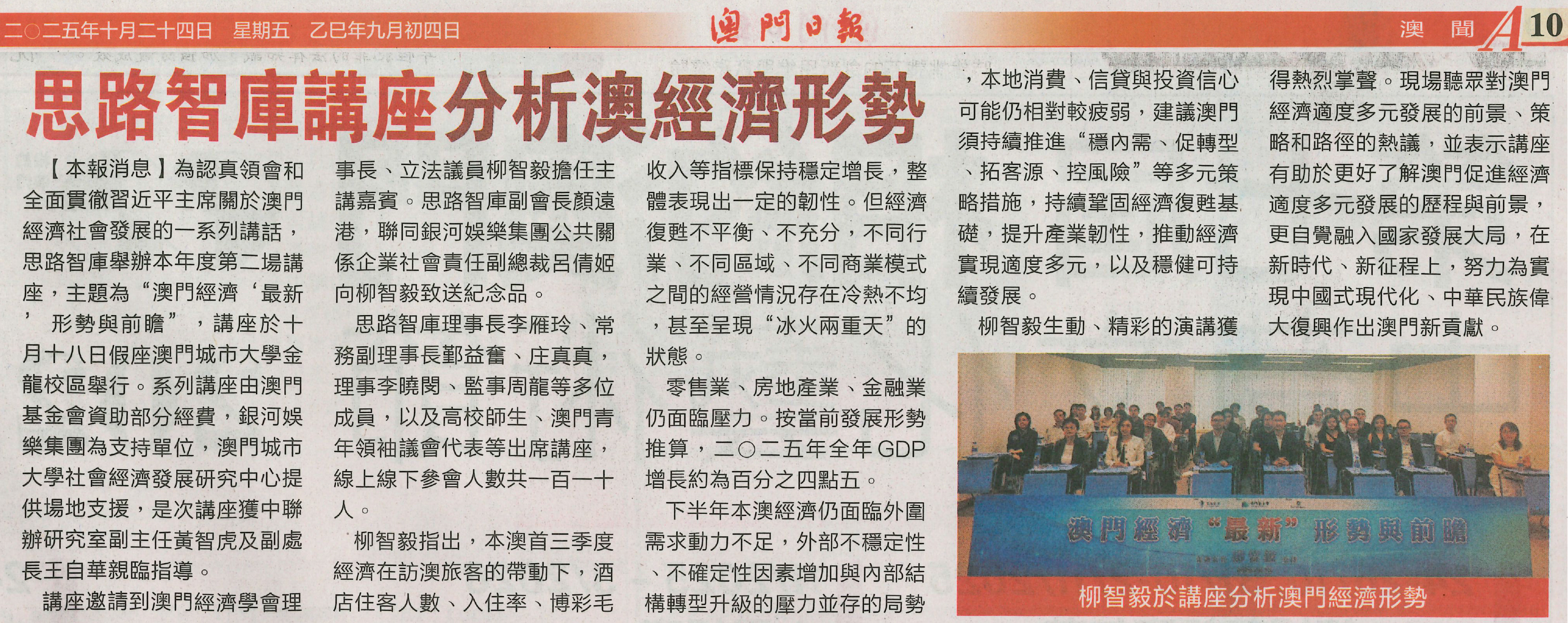 | 思路智庫講座分析澳經濟形勢 【本報消息】為認真領會和全面貫徹習近平主席關於澳門經濟社會發展的一系列講話,思路智庫舉辦本年度第二場講座,主題為“澳門經濟‘最新’ 形勢與前瞻”,講座於十月十八日假座澳門城市大學金龍校區舉行。系列講座由澳門基金會資助部分經費,銀河娛樂集團為支持單位,澳門城市大學社會經濟發展研究中心提供場地支援,是次講座獲中聯辦研究室副主任黃智虎及副處長王自華親臨指導。 講座邀請到澳門經濟學會理事長、立法議員柳智毅擔任主講嘉賓。思路智庫副會長顏遠港,聯同銀河娛樂集團公共關係企業社會責任副總裁呂倩姬向柳智毅致送紀念品。 思路智庫理事長李雁玲、常務副理事長鄞益奮、庄真真,理事李曉閔、監事周龍等多位成員,以及高校師生、澳門青年領袖議會代表等出席講座,線上線下參會人數共一百一十人。 柳智毅指出,本澳首三季度經濟在訪澳旅客的帶動下,酒店住客人數、入住率、博彩毛收入等指標保持穩定增長,整體表現出一定的韌性。但經濟復甦不平衡、不充分,不同行業、不同區域、不同商業模式之間的經營情況存在冷熱不均,甚至呈現“冰火兩重天”的狀態。 零售業、房地產業、金融業仍面臨壓力。按當前發展形勢推算,二〇二五年全年GDP增長約為百分之四點五。 下半年本澳經濟仍面臨外圍需求動力不足,外部不穩定性、不確定性因素增加與內部結構轉型升級的壓力並存的局勢,本地消費、信貸與投資信心可能仍相對較疲弱,建議澳門須持續推進“穩內需、促轉型、拓客源、控風險”等多元策略措施,持續鞏固經濟復甦基礎,提升產業韌性,推動經濟實現適度多元,以及穩健可持續發展。 柳智毅生動、精彩的演講獲得熱烈掌聲。現場聽眾對澳門經濟適度多元發展的前景、策略和路徑的熱議,並表示講座有助於更好了解澳門促進經濟適度多元發展的歷程與前景,更自覺融入國家發展大局,在新時代、新征程上,努力為實現中國式現代化、中華民族偉大復興作出澳門新貢獻。 詳閱: 澳門日報A10。 |