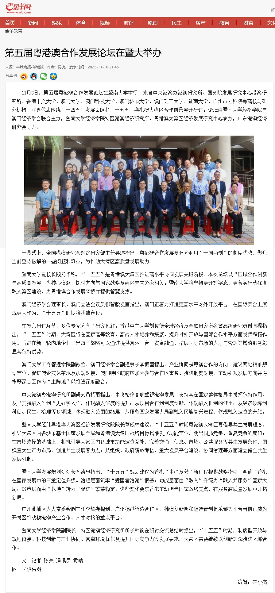 | 11月8日,第五届粤港澳合作发展论坛在暨南大学举行,来自中央港澳办港澳研究所、国务院发展研究中心港澳研究所、香港中文大学、澳门大学、澳门科技大学、澳门城市大学、澳门理工大学、暨南大学、广州市社科院等高校与研究机构、业界代表围绕“十四五”发展回顾和“十五五”粤港澳大湾区合作前景展开研讨。论坛由暨南大学经济学院与澳门经济学会联合主办,暨南大学经济学院特区港澳经济研究所、粤港澳大湾区经济发展研究中心承办,广东港澳经济研究会协办。 开幕式上,全国港澳研究会经济研究部主任吴炜指出,粤港澳合作发展要充分利用“一国两制”的制度优势,聚焦当前亟待破解的一些问题和难点,为推动大湾区高质量发展助力。 暨南大学副校长顾乃华称,“十五五”是粤港澳大湾区推进高水平协同发展关键阶段。本次论坛以“区域合作创新与高质量发展”为核心议题,探讨方向与国家战略及湾区未来紧密相关。暨南大学将坚持更开放姿态、更务实行动深度融入湾区建设,为粤港澳合作发展架桥并提供智慧支撑。 澳门经济学会理事长、澳门立法会议员柳智毅发言指出,澳门正着力打造更高水平对外开放平台,在国际舞台上展现更大作为,“十五五”时期将找准定位。 在发言研讨环节,多位专家分享了研究见解。香港中文大学刘佐德全球经济及金融研究所名誉高级研究员谢国樑指出,“十五五”时期,大湾区将在国家高等教育、高端人才培养和集聚、提升对外开放与国际合作水平方面发挥积极作用。香港在新一轮内地企业“出海”战略可以通过提供营运平台、资金融通、拓展国际市场的人才与管理等增值服务彰显其独特优势。 澳门大学工商管理学院副教授、澳门经济学会副理事长李振国提出,产业协同是粤澳合作的方向,建议两地精准规划定位、促进澳企实体落地及法规对接,澳门特区政府应加大参与合作区事务、推进制度对接、主动引领发展方向并将横琴深合区作为“主阵地”以推进深度融合。 中央港澳办港澳研究所副研究员杨丽指出,中央始终高度重视港澳发展,支持其在国家整体格局中发挥独特作用,从“支持融入”到“更好融入”,体现融入深度的提升;从项目合作到制度创新,体现融入机制的健全;从经济领域到科创、民生、治理等多领域,体现融入范围的拓展;从服务国家发展大局到融入民族复兴进程,体现融入定位的升维。 暨南大学经纬粤港澳大湾区经济发展研究院院长覃成林建议,“十五五”时期粤港澳大湾区要倡导共生发展理念,引导大湾区内各城市基于国家发展全局和粤港澳大湾区战略目标找准发展功能定位,跳出同质竞争、重复竞争的窠臼;在市场选择的基础上,相机引导大湾区内各城市功能定位互补;完善交通、信息、市场、公共服务等共生发展条件;围绕重大生产力布局,创造共生发展着力点;从组织、政府绩效考核、重大发展平台建设、协同治理等方面建立健全共生发展机制。 暨南大学发展规划处处长孙清忠指出,“十五五”规划建议为香港“由治及兴”新征程提供战略指引,明确了香港在国家发展中的三重定位升级。治理层面筑牢“爱国者治港”根基;功能层面由“融入”升级为“融入并服务”国家大局;政策层面由“保持”转为“促进”繁荣稳定。这些变化要求香港主动担当国家战略支点,在服务高质量发展中开拓新局。 广州黄埔区人大常委会副主任李耀尧提到,广州穗港智造合作区、穗澳创新园和穗澳青创俱乐部等平台当前已成为开发区推动穗港澳产业合作、人才对接的重点平台。 暨南大学经济学院副院长、特区港澳经济研究所所长钟韵在研讨交流总结时提出,“十五五”时期,制度型开放与规则衔接、科技创新与产业协同、营商环境优化及提升国际竞争力等发展要求,大湾区需要继续以创新理念推进区域合作。 詳閱: 羊城晚报。 |