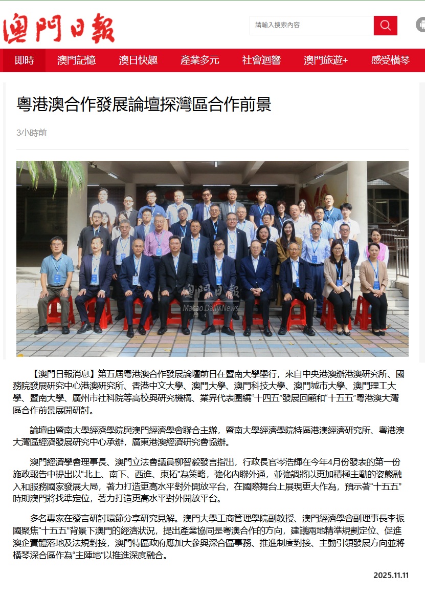| 【澳門日報消息】第五屆粵港澳合作發展論壇前日在暨南大學舉行,來自中央港澳辦港澳研究所、國務院發展研究中心港澳研究所、香港中文大學、澳門大學、澳門科技大學、澳門城市大學、澳門理工大學、暨南大學、廣州市社科院等高校與研究機構、業界代表圍繞“十四五”發展回顧和“十五五”粵港澳大灣區合作前景展開研討。 論壇由暨南大學經濟學院與澳門經濟學會聯合主辦,暨南大學經濟學院特區港澳經濟研究所、粵港澳大灣區經濟發展研究中心承辦,廣東港澳經濟研究會協辦。 澳門經濟學會理事長、澳門立法會議員柳智毅發言指出,行政長官岑浩輝在今年4月份發表的第一份施政報告中提出以“北上、南下、西進、東拓”為策略,強化內聯外通,並強調將以更加積極主動的姿態融入和服務國家發展大局,著力打造更高水平對外開放平台,在國際舞台上展現更大作為,預示著“十五五”時期澳門將找準定位,著力打造更高水平對外開放平台。 多名專家在發言研討環節分享研究見解。澳門大學工商管理學院副教授、澳門經濟學會副理事長李振國聚焦“十五五”背景下澳門的經濟狀況,提出產業協同是粵澳合作的方向,建議兩地精準規劃定位、促進澳企實體落地及法規對接,澳門特區政府應加大參與深合區事務、推進制度對接、主動引領發展方向並將橫琴深合區作為“主陣地”以推進深度融合。 詳閱: 澳門日報(即時新聞)。 |
