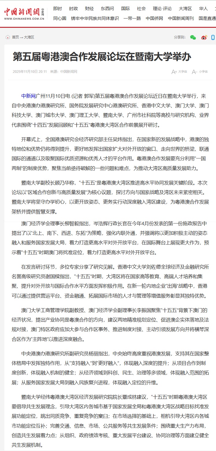 | 第五届粤港澳合作发展论坛在暨南大学举办 广州11月10日电 (记者 郭军)第五届粤港澳合作发展论坛近日在暨南大学举行,来自中央港澳办港澳研究所、国务院发展研究中心港澳研究所、香港中文大学、澳门大学、澳门科技大学、澳门城市大学、澳门理工大学、暨南大学、广州市社科院等高校与研究机构、业界代表围绕“十四五”发展回顾和“十五五”粤港澳大湾区合作前景展开研讨。 开幕式上,全国港澳研究会经济研究部主任吴炜指出,在国家新的发展战略中,港澳的独特地位和优势仍将得到提升,更好地发挥出国家扩大对外开放的窗口、走向世界的桥梁、联通国际的通道以及吸聚国际优质资源和优秀人才的平台作用。粤港澳合作发展要充分利用“一国两制”的制度优势,聚焦当前亟待破解的一些问题和难点,为推动大湾区高质量发展助力。 暨南大学副校长顾乃华称,“十五五”是粤港澳大湾区推进高水平协同发展关键阶段。本次论坛以“区域合作创新与高质量发展”为核心议题,探讨方向与国家战略及湾区未来紧密相关。暨南大学将坚守办学初心,以更开放姿态、更务实行动深度融入湾区建设,为粤港澳合作发展架桥幷提供智慧支撑。 澳门经济学会理事长柳智毅指出,岑浩辉行政长官在今年4月份发表的第一份施政报告中提出了以“北上、南下、西进、东拓”为策略,强化内联外通,幷强调将以更加积极主动的姿态融入和服务国家发展大局,着力打造更高水平对外开放平台,在国际舞台上展现更大作为,预示着“十五五”时期澳门将找准定位,着力打造更高水平对外开放平台。 在发言研讨环节,多位专家分享了研究见解。香港中文大学刘佐德全球经济及金融研究所名誉高级研究员谢国梁指出,“十五五”时期,大湾区将在国家高等教育、高端人才培养和集聚、提升对外开放与国际合作水平方面发挥积极作用。在新一轮内地企业“出海”战略中,香港可以通过提供营运平台、资金融通、拓展国际市场的人才与管理等增值服务彰显其独特优势。 澳门大学工商管理学院副教授、澳门经济学会副理事长李振国聚焦“十五五”背景下澳门的经济状况,提出产业协同是粤澳合作的方向,建议两地精准规划定位、促进澳企实体落地及法规对接,澳门特区政府应加大参与合作区事务、推进制度对接、主动引领发展方向幷将横琴深合区作为“主阵地”以推进深度融合。 中央港澳办港澳研究所副研究员杨丽指出,中央始终高度重视港澳发展,支持其在国家整体格局中发挥独特作用,从“支持融入”到“更好融入”,体现融入深度的提升;从项目合作到制度创新,体现融入机制的健全;从经济领域到科创、民生、治理等多领域,体现融入范围的拓展;从服务国家发展大局到融入民族复兴进程,体现融入定位的升维。 暨南大学经纬粤港澳大湾区经济发展研究院院长覃成林建议,“十五五”时期粤港澳大湾区要倡导共生发展理念,引导大湾区内各城市基于国家发展全域和粤港澳大湾区战略目标找准发展功能定位,跳出同质竞争、重复竞争的窠臼;在市场选择的基础上,相机引导大湾区内各城市功能定位互补;完善交通、信息、市场、公共服务等共生发展条件;围绕重大生产力布局,创造共生发展着力点;从组织、政府绩效考核、重大发展平台建设、协同治理等方面建立健全共生发展机制。 论坛由暨南大学经济学院与澳门经济学会联合主办。(完) 【编辑:李岩】 詳閱: 中國新聞網。 |