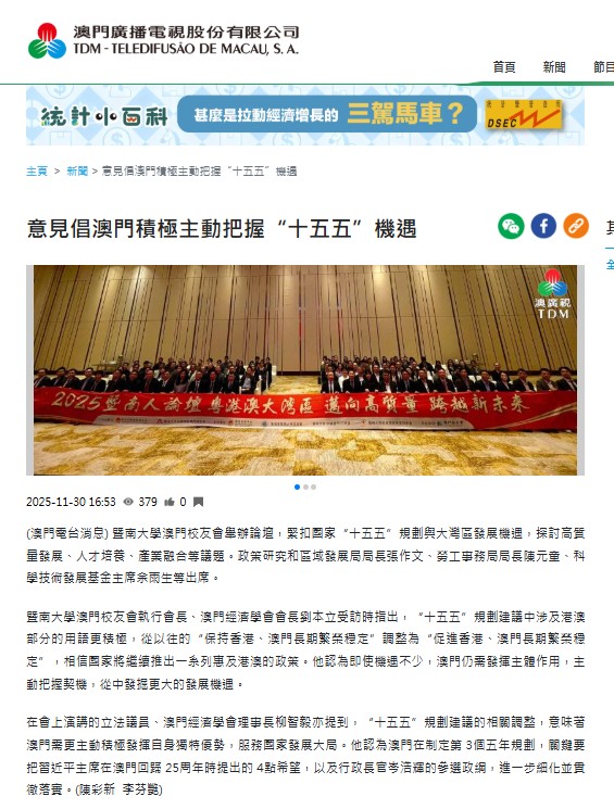 | (澳門電台消息) 暨南大學澳門校友會舉辦論壇,緊扣國家“十五五”規劃與大灣區發展機遇,探討高質量發展、人才培養、產業融合等議題。政策研究和區域發展局局長張作文、勞工事務局局長陳元童、科學技術發展基金主席余雨生等出席。 暨南大學澳門校友會執行會長、澳門經濟學會會長劉本立受訪時指出,“十五五”規劃建議中涉及港澳部分的用語更積極,從以往的“保持香港、澳門長期繁榮穩定”調整為“促進香港、澳門長期繁榮穩定”,相信國家將繼續推出一系列惠及港澳的政策。他認為即使機遇不少,澳門仍需發揮主體作用,主動把握契機,從中發掘更大的發展機遇。 在會上演講的立法議員、澳門經濟學會理事長柳智毅亦提到,“十五五”規劃建議的相關調整,意味著澳門需更主動積極發揮自身獨特優勢,服務國家發展大局。他認為澳門在制定第 3個五年規劃,關鍵要把習近平主席在澳門回歸 25周年時提出的 4點希望,以及行政長官岑浩輝的參選政綱,進一步細化並貫徹落實。(陳彩新 李芬艷) 詳閱: 澳廣視TDM(電台新聞)。 |