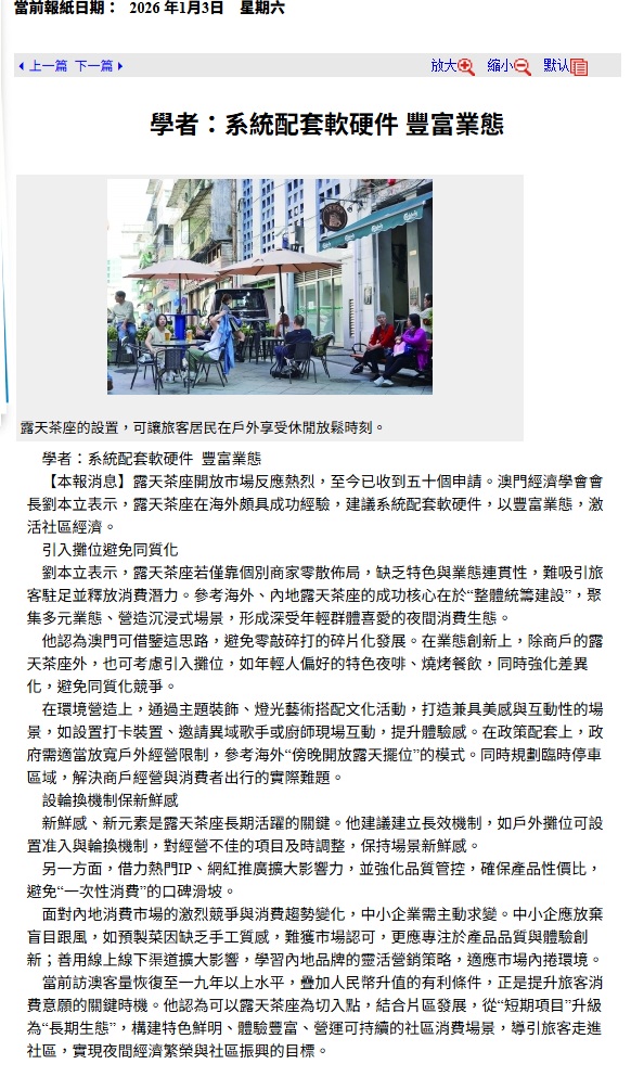 | 學者:系統配套軟硬件 豐富業態 【本報消息】露天茶座開放市場反應熱烈,至今已收到五十個申請。澳門經濟學會會長劉本立表示,露天茶座在海外頗具成功經驗,建議系統配套軟硬件,以豐富業態,激活社區經濟。 引入攤位避免同質化 劉本立表示,露天茶座若僅靠個別商家零散佈局,缺乏特色與業態連貫性,難吸引旅客駐足並釋放消費潛力。參考海外、內地露天茶座的成功核心在於“整體統籌建設”,聚集多元業態、營造沉浸式場景,形成深受年輕群體喜愛的夜間消費生態。 他認為澳門可借鑒這思路,避免零敲碎打的碎片化發展。在業態創新上,除商戶的露天茶座外,也可考慮引入攤位,如年輕人偏好的特色夜啡、燒烤餐飲,同時強化差異化,避免同質化競爭。 在環境營造上,通過主題裝飾、燈光藝術搭配文化活動,打造兼具美感與互動性的場景,如設置打卡裝置、邀請異域歌手或廚師現場互動,提升體驗感。在政策配套上,政府需適當放寬戶外經營限制,參考海外“傍晚開放露天擺位”的模式。同時規劃臨時停車區域,解決商戶經營與消費者出行的實際難題。 設輪換機制保新鮮感 新鮮感、新元素是露天茶座長期活躍的關鍵。他建議建立長效機制,如戶外攤位可設置准入與輪換機制,對經營不佳的項目及時調整,保持場景新鮮感。 另一方面,借力熱門IP、網紅推廣擴大影響力,並強化品質管控,確保產品性價比,避免“一次性消費”的口碑滑坡。 面對內地消費市場的激烈競爭與消費趨勢變化,中小企業需主動求變。中小企應放棄盲目跟風,如預製菜因缺乏手工質感,難獲市場認可,更應專注於產品品質與體驗創新;善用線上線下渠道擴大影響,學習內地品牌的靈活營銷策略,適應市場內捲環境。 當前訪澳客量恢復至一九年以上水平,疊加人民幣升值的有利條件,正是提升旅客消費意願的關鍵時機。他認為可以露天茶座為切入點,結合片區發展,從“短期項目”升級為“長期生態”,構建特色鮮明、體驗豐富、營運可持續的社區消費場景,導引旅客走進社區,實現夜間經濟繁榮與社區振興的目標。 詳閱: 澳門日報。 |