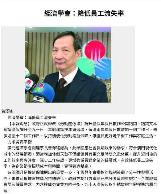| 經濟學會:降低員工流失率 【本報消息】政府正就修改《勞動關係法》調升產假年假日數作公開諮詢,諮詢文本建議產假調升至九十日,年假建議按年資遞增,每滿兩年年假日數增加一個工作日,最多增至十二個工作日,以持續優化勞動權益保障,讓僱員更好地平衡工作與家庭生活。 力求勞資平衡 澳門經濟學會副理事長曾澤瑤認為,此舉回應社會長期以來的訴求,符合澳門現代化城市的發展節奏,適當增加休假天數不僅讓僱員有更充足時間充電休整,提升返崗後的工作效率與專注度,減少工作失誤,更增強僱員對企業的歸屬感,有效降低員工流失率,為企業節省招聘成本與時間,實現勞資雙贏。 有關調升是權益保障邁出的重要一步,年假與年資掛鉤的機制兼顧了公平性與靈活性,未來可根據實施情況持續優化。政府在制訂方案時已充分考量現有規定、企業經營實際及僱員需求,力求達成勞資雙方的平衡,九十天產假及逐步遞增的年假標準均屬合理。 詳閱: 澳門日報。 |