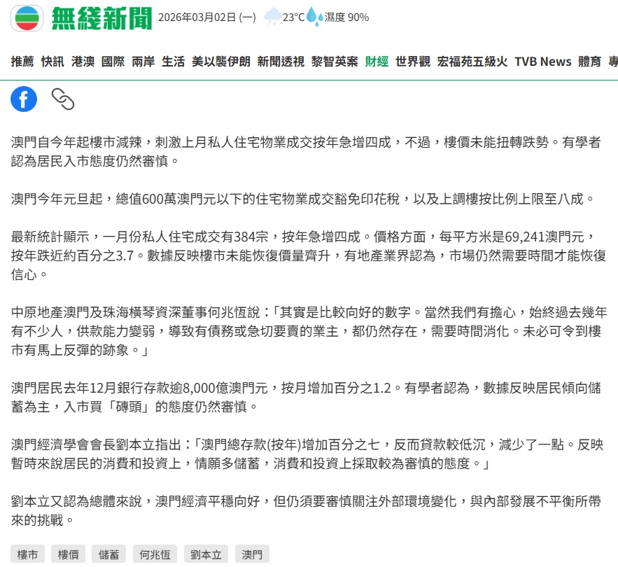 | 澳門樓市減辣未能扭轉樓價跌勢 有學者認為居民入市態度仍審慎 |