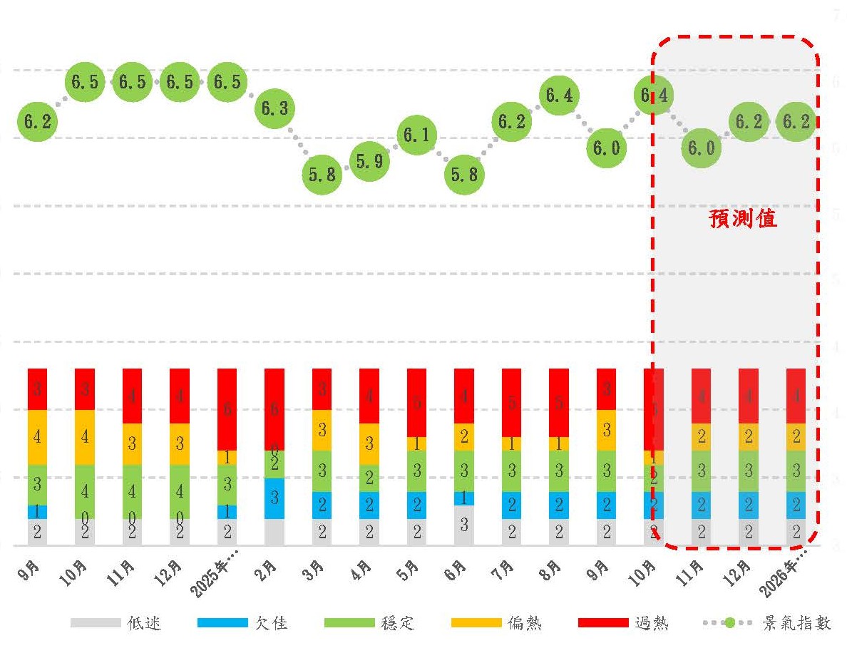 綜合旅遊休閒業帶動,景氣持續穩定 九至十月期間,澳門經濟景氣指標總體保續穩定態勢。同步指標持續在“穩定”至“偏熱”,領先及滯後指標則持續呈現“過熱”、“低迷”和“欠佳”兩極化現象。九月雖受超強颱風影響,日均入境旅客及博彩業毛收入有所回落但仍能保持相對高位,維持在“穩定”水平;酒店客房日均住客3.7萬人次,入住率84.6%,均屬“偏熱”等級。十月受惠於內地“黃金周”長假帶動訪客量增長,旅遊及休閒娛樂業表現亮眼,多項指標創下新高,日均博彩毛收入高達7.77億元,但本地消費、信貸與投資信心仍相對疲弱。經綜合分析與推算,九、十月份的經濟景氣指數分別為6.0分及6.4分,整體維持在“穩定”等級。