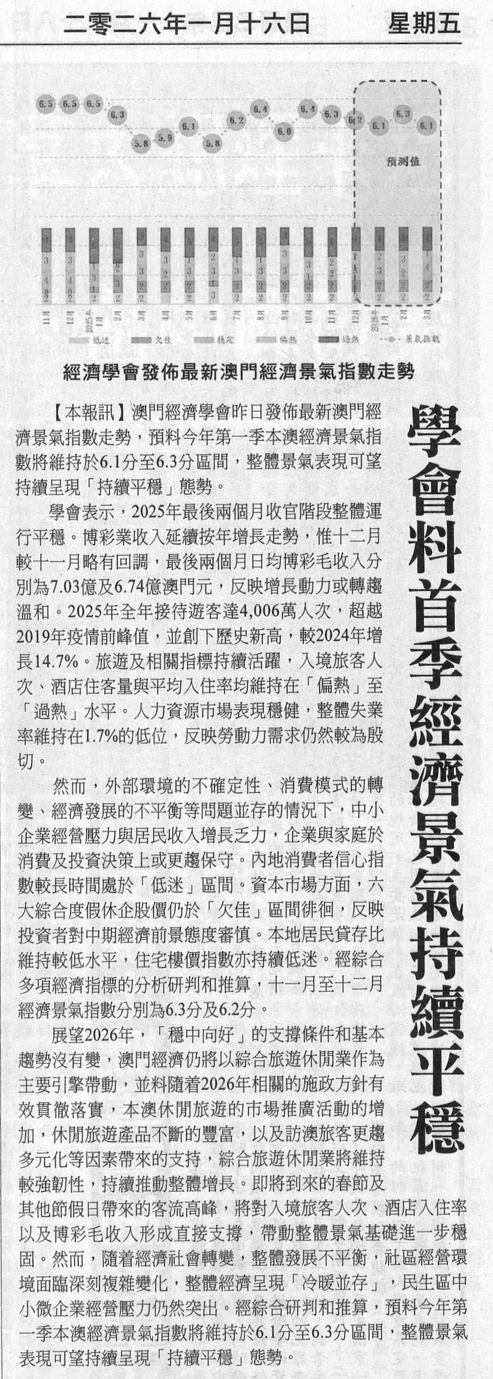 | 【本報訊】澳門經濟學會昨日發佈最新澳門經濟景氣指數走勢,預料今年第一季本澳經濟景氣指數將維持於6.1分至6.3分區間,整體景氣表現可望持續呈現「持續平穩」態勢。 學會表示,2025年最後兩個月收官階段整體運行平穩。博彩業收入延續按年增長走勢,惟十二月較十一月略有回調,最後兩個月日均博彩毛收入分別為7.03億及6.74億澳門元,反映增長動力或轉趨溫和。 2025年全年接待遊客達4,006萬人次,超越2019年疫情前峰值,並創下歷史新高,較2024年增14.7%。旅遊及相關指標持續活躍,入境旅客人次、酒店住客量與平均入住率均維持在「偏熱」至「過熱」水平。人力資源市場表現穩健,整體失業率維持在1.7%的低位,反映勞動力需求仍然較為殷切。 然而,外部環境的不確定性、消費模式的轉變、經濟發展的不平衡等問題並存的情況下,中小企業經營壓力與居民收入增長乏力,企業與家庭於消費及投資決策上或更趨保守。內地消費者信心指數較長時間處於「低迷」區間。資本市場方面,六大綜合度假休企股價仍於「欠佳」區間徘徊,反映投資者對中期經濟前景態度審慎。本地居民貸存比維持較低水平,住宅樓價指數亦持續低迷。經綜合多項經濟指標的分析研判和推算,十一月至十二月經濟景氣指數分別為6.3分及6.2分。 展望2026年,「穩中向好」的支撐條件和基本趨勢沒有變,澳門經濟仍將以綜合旅遊休閒業作為主要引擎帶動,並料隨着2026年相關的施政方針有效貫徹落實,本澳休閒旅遊的市場推廣活動的增加,休閒旅遊產品不斷的豐富,以及訪澳旅客更趨多元化等因素帶來的支持,綜合旅遊休閒業將維持較強韌性,持續推動整體增長。即將到來的春節及其他節假日帶來的客流高峰,將對入境旅客人次、酒店入住率以及博彩毛收入形成直接支撐,帶動整體景氣基礎進一步穩固。然而,隨着經濟社會轉變,整體發展不平衡,社區經營環境面臨深刻複雜變化,整體經濟呈現「冷暖並存」,民生區中小微企業經營壓力仍然突出。經綜合研判和推算,預料今年第一季本澳經濟景氣指數將維持於6.1分至6.3分區間,整體景氣表現可望持續呈現「持續平穩」態勢。 詳閱: 新華澳報。 |
