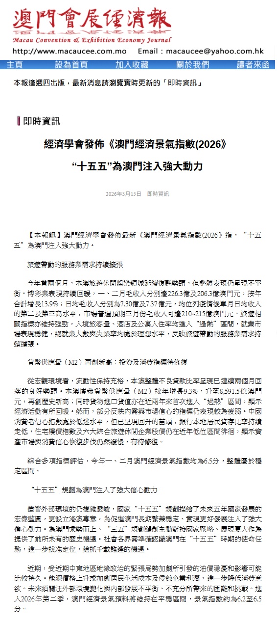| 【本報訊】澳門經濟學會發佈最新《澳門經濟景氣指數(2026》指,“十五五”為澳門注入強大動力。 旅遊帶動的服務業需求持續擴張 今年首兩個月,本澳旅遊休閒娛樂領域延續復甦勢頭,但整體表現仍呈現不平衡。博彩業表現持續回暖,一、二月毛收入分別達226.3億及206.3億澳門元,按年合計增長13.9%;日均毛收入分別為7.30億及7.37億元,均位列疫情後單月日均收入的第二及第三高水平;市場普遍預期三月份毛收入可達210~215億澳門元。旅遊相關指標亦維持強勁,入境旅客量、酒店及公寓入住率均進入“過熱”區間,就業市場表現穩健,總就業人數與失業率均處於理想水平,反映旅遊帶動的服務業需求持續擴張。 貨幣供應量(M2)再創新高;投資及消費指標待修復 從宏觀環境看,流動性保持充裕,本澳整體不良貸款比率呈現已連續兩個月回落的良好勢頭。本澳廣義貨幣供應量(M2)按年增長9.3%,升至8,591.5億澳門元,再創歷史新高;同時貨物進口貨值亦在近兩年來首次進入“過熱”區間,顯示經濟活動有所回暖。然而,部分反映內需與市場信心的指標仍表現較為疲弱。中國消費者信心指數處於低迷水平,但已呈現回升的苗頭;銀行本地居民貸存比率持續走低,住宅樓價指數及六大綜合旅遊休閒企業股價仍在近年低位區間徘徊,顯示資產市場與消費信心恢復步伐仍然緩慢,有待修復。 綜合多項指標評估,今年一、二月澳門經濟景氣指數均為6.5分,整體屬於穩定區間。 “十五五”規劃為澳門注入了強大信心動力 儘管外部環境的仍複雜嚴峻,國家“十五五”規劃描繪了未來五年國家發展的宏偉藍圖,更設立港澳專章,為促進澳門長期繁榮穩定、實現更好發展注入了強大信心動力。為澳門乘勢而上、“三五”規劃編制主動對接國家戰略、展現更大作為提供了前所未有的歷史機遇。社會各界需準確認識澳門在“十五五”時期的使命任務,進一步找准定位,搶抓千載難逢的機遇。 近期,受近期中東地區地緣政治的緊張局勢加劇所引發的油價隱憂和影響可能比較持久。能源價格上升或加劇居民生活成本及侵蝕企業利潤,進一步降低消費意欲。未來須關注外部環境變化與內部發展不平衡、不充分所帶來的困難和挑戰。進入2026年第二季,澳門經濟景氣預料將維持在平穩區間,景氣指數約為6.2至6.5分。 詳閱: 澳門會展經濟報。 |