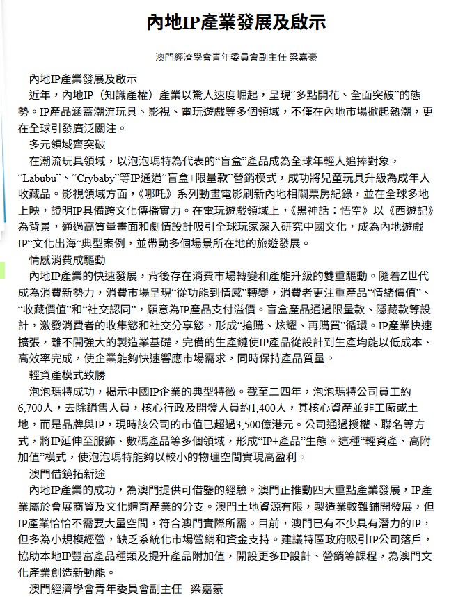 內地IP產業發展及啟示 近年,內地IP(知識產權)產業以驚人速度崛起,呈現“多點開花、全面突破”的態勢。IP產品涵蓋潮流玩具、影視、電玩遊戲等多個領域,不僅在內地市場掀起熱潮,更在全球引發廣泛關注。 元領域齊突破 在潮流玩具領域,以泡泡瑪特為代表的“盲盒”產品成為全球年輕人追捧對象,“Labubu”、“Crybaby”等IP通過“盲盒+限量款”營銷模式,成功將兒童玩具升級為成年人收藏品。影視領域方面,《哪吒》系列動畫電影刷新內地相關票房紀錄,並在全球多地上映,證明IP具備跨文化傳播實力。在電玩遊戲領域上,《黑神話:悟空》以《西遊記》為背景,通過高質量畫面和劇情設計吸引全球玩家深入研究中國文化,成為內地遊戲IP“文化出海”典型案例,並帶動多個場景所在地的旅遊發展。 情感消費成驅動 內地IP產業的快速發展,背後存在消費市場轉變和產能升級的雙重驅動。隨着Z世代成為消費新勢力,消費市場呈現“從功能到情感”轉變,消費者更注重產品“情緒價值”、“收藏價值”和“社交認同”,願意為IP產品支付溢價。盲盒產品通過限量款、隱藏款等設計,激發消費者的收集慾和社交分享慾,形成“搶購、炫耀、再購買”循環。IP產業快速擴張,離不開強大的製造業基礎,完備的生產鏈使IP產品從設計到生產均能以低成本、高效率完成,使企業能夠快速響應市場需求,同時保持產品質量。 輕資產模式致勝 泡泡瑪特成功,揭示中國IP企業的典型特徵。截至二四年,泡泡瑪特公司員工約6,700人,去除銷售人員,核心行政及開發人員約1,400人,其核心資產並非工廠或土地,而是品牌與IP,現時該公司的市值已超過3,500億港元。公司通過授權、聯名等方式,將IP延伸至服飾、數碼產品等多個領域,形成“IP+產品”生態。這種“輕資產、高附加值”模式,使泡泡瑪特能夠以較小的物理空間實現高盈利。 澳門借鏡拓新途 內地IP產業的成功,為澳門提供可借鑒的經驗。澳門正推動四大重點產業發展,IP產業屬於會展商貿及文化體育產業的分支。澳門土地資源有限,製造業較難鋪開發展,但IP產業恰恰不需要大量空間,符合澳門實際所需。目前,澳門已有不少具有潛力的IP,但多為小規模經營,缺乏系統化市場營銷和資金支持。建議特區政府吸引IP公司落戶,協助本地IP豐富產品種類及提升產品附加值,開設更多IP設計、營銷等課程,為澳門文化產業創造新動能。 澳門經濟學會青年委員會副主任 梁嘉豪 新聞剪報詳閱: 澳門日報。 |