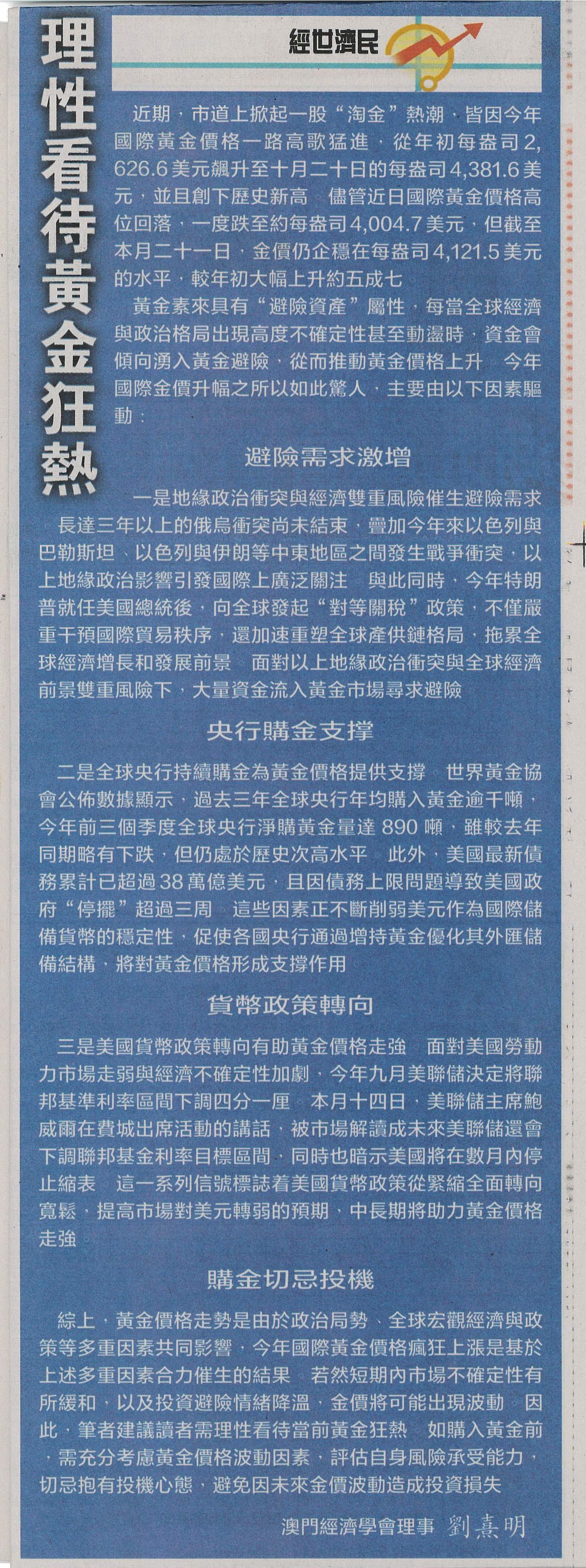 | 理性看待黃金狂熱 近期,市道上掀起一股“淘金”熱潮,皆因今年國際黃金價格一路高歌猛進,從年初每盎司2,626.6美元飆升至十月二十日的每盎司4,381.6美元,並且創下歷史新高。儘管近日國際黃金價格高位回落,一度跌至約每盎司4,004.7美元,但截至本月二十一日,金價仍企穩在每盎司4,121.5美元的水平,較年初大幅上升約五成七。 黃金素來具有“避險資產”屬性,每當全球經濟與政治格局出現高度不確定性甚至動盪時,資金會傾向湧入黃金避險,從而推動黃金價格上升。今年國際金價升幅之所以如此驚人,主要由以下因素驅動︰ 一是地緣政治衝突與經濟雙重風險催生避險需求。長達三年以上的俄烏衝突尚未結束,疊加今年來以色列與巴勒斯坦、以色列與伊朗等中東地區之間發生戰爭衝突,以上地緣政治影響引發國際上廣泛關注。與此同時,今年特朗普就任美國總統後,向全球發起“對等關稅”政策,不僅嚴重干預國際貿易秩序,還加速重塑全球產供鏈格局,拖累全球經濟增長和發展前景。面對以上地緣政治衝突與全球經濟前景雙重風險下,大量資金流入黃金市場尋求避險。 央行購金支撑 二是全球央行持續購金為黃金價格提供支撐。世界黃金協會公佈數據顯示,過去三年全球央行年均購入黃金逾千噸,今年前三個季度全球央行淨購黃金量達 890 噸,雖較去年同期略有下跌,但仍處於歷史次高水平。此外,美國最新債務累計已超過38萬億美元,且因債務上限問題導致美國政府“停擺”超過三周。這些因素正不斷削弱美元作為國際儲備貨幣的穩定性,促使各國央行通過增持黃金優化其外匯儲備結構,將對黃金價格形成支撐作用。 貨幣政策轉向 三是美國貨幣政策轉向有助黃金價格走強。面對美國勞動力市場走弱與經濟不確定性加劇,今年九月美聯儲決定將聯邦基準利率區間下調四分一厘。本月十四日,美聯儲主席鮑威爾在費城出席活動的講話,被市場解讀成未來美聯儲還會下調聯邦基金利率目標區間,同時也暗示美國將在數月內停止縮表。這一系列信號標誌着美國貨幣政策從緊縮全面轉向寬鬆,提高市場對美元轉弱的預期,中長期將助力黃金價格走強。 購金切忌投機 綜上,黃金價格走勢是由於政治局勢、全球宏觀經濟與政策等多重因素共同影響,今年國際黃金價格瘋狂上漲是基於上述多重因素合力催生的結果。若然短期內市場不確定性有所緩和,以及投資避險情緒降溫,金價將可能出現波動。因此,筆者建議讀者需理性看待當前黃金狂熱。如購入黃金前,需充分考慮黃金價格波動因素,評估自身風險承受能力,切忌抱有投機心態,避免因未來金價波動造成投資損失。 澳門經濟學會理事 劉熹明 新聞剪報詳閱: 澳門日報。 ![]() |
