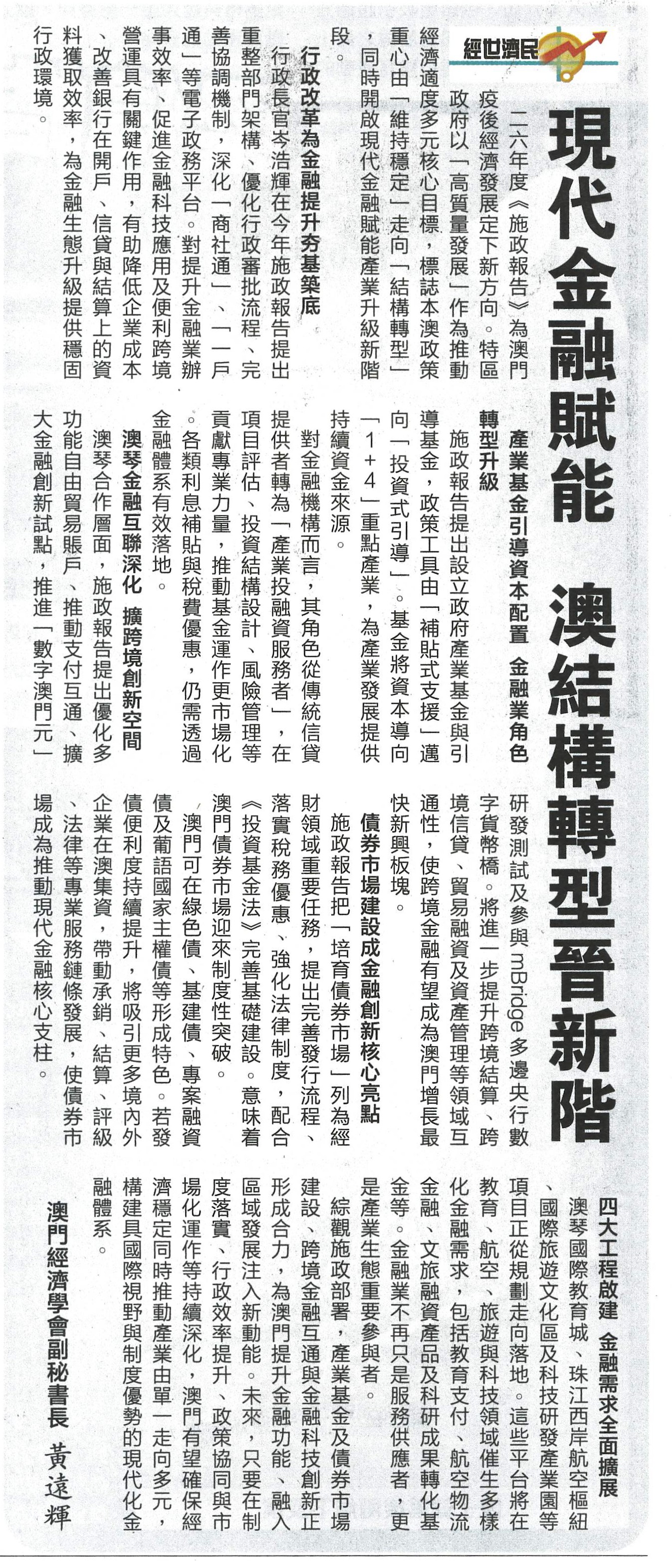 | 現代金融賦能 澳結構轉型晉新階 二六年度《施政報告》為澳門疫後經濟發展定下新方向。特區政府以“高質量發展”作為推動經濟適度多元核心目標,標誌本澳政策重心由“維持穩定”走向“結構轉型”,同時開啟現代金融賦能產業升級新階段。 行政改革為金融提升夯基築底 行政長官岑浩輝在今年施政報告提出重整部門架構、優化行政審批流程、完善協調機制,深化“商社通”、“一戶通”等電子政務平台。對提升金融業辦事效率、促進金融科技應用及便利跨境營運具有關鍵作用,有助降低企業成本、改善銀行在開戶、信貸與結算上的資料獲取效率,為金融生態升級提供穩固行政環境。 產業基金引導資本配置 金融業角色轉型升級 施政報告提出設立政府產業基金與引導基金,政策工具由“補貼式支援”邁向“投資式引導”。基金將資本導向“1+4”重點產業,為產業發展提供持續資金來源。 對金融機構而言,其角色從傳統信貸提供者轉為“產業投融資服務者”,在項目評估、投資結構設計、風險管理等貢獻專業力量,推動基金運作更市場化。各類利息補貼與稅費優惠,仍需透過金融體系有效落地。 澳琴金融互聯深化 擴跨境創新空間 澳琴合作層面,施政報告提出優化多功能自由貿易賬戶、推動支付互通、擴大金融創新試點,推進“數字澳門元”研發測試及參與mBridge多邊央行數字貨幣橋。將進一步提升跨境結算、跨境信貸、貿易融資及資產管理等領域互通性,使跨境金融有望成為澳門增長最快新興板塊。 債券市場建設成金融創新核心亮點 施政報告把“培育債券市場”列為經財領域重要任務,提出完善發行流程、落實稅務優惠、強化法律制度,配合《投資基金法》完善基礎建設。意味着澳門債券市場迎來制度性突破。 澳門可在綠色債、基建債、專案融資債及葡語國家主權債等形成特色。若發債便利度持續提升,將吸引更多境內外企業在澳集資,帶動承銷、結算、評級、法律等專業服務鏈條發展,使債券市場成為推動現代金融核心支柱。 四大工程啟建 金融需求全面擴展 澳琴國際教育城、珠江西岸航空樞紐、國際旅遊文化區及科技研發產業園等項目正從規劃走向落地。這些平台將在教育、航空、旅遊與科技領域催生多樣化金融需求,包括教育支付、航空物流金融、文旅融資產品及科研成果轉化基金等。金融業不再只是服務供應者,更是產業生態重要參與者。 綜觀施政部署,產業基金及債券市場建設、跨境金融互通與金融科技創新正形成合力,為澳門提升金融功能、融入區域發展注入新動能。未來,只要在制度落實、行政效率提升、政策協同與市場化運作等持續深化,澳門有望確保經濟穩定同時推動產業由單一走向多元,構建具國際視野與制度優勢的現代化金融體系。 澳門經濟學會副秘書長 黃遠輝 新聞剪報詳閱: 澳門日報。 |