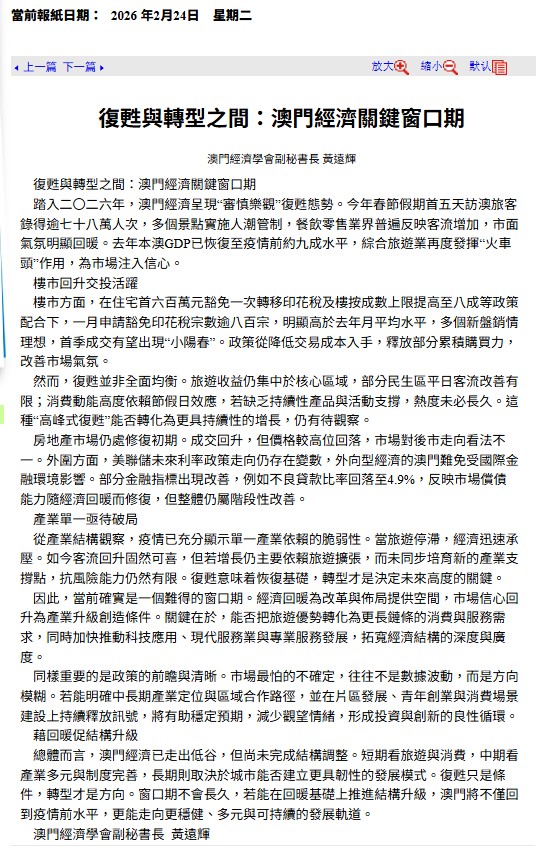 | 復甦與轉型之間:澳門經濟關鍵窗口期 踏入二〇二六年,澳門經濟呈現“審慎樂觀”復甦態勢。今年春節假期首五天訪澳旅客錄得逾七十八萬人次,多個景點實施人潮管制,餐飲零售業界普遍反映客流增加,市面氣氛明顯回暖。去年本澳GDP已恢復至疫情前約九成水平,綜合旅遊業再度發揮“火車頭”作用,為市場注入信心。 樓市回升交投活躍 樓市方面,在住宅首六百萬元豁免一次轉移印花稅及樓按成數上限提高至八成等政策配合下,一月申請豁免印花稅宗數逾八百宗,明顯高於去年月平均水平,多個新盤銷情理想,首季成交有望出現“小陽春”。政策從降低交易成本入手,釋放部分累積購買力,改善市場氣氛。 然而,復甦並非全面均衡。旅遊收益仍集中於核心區域,部分民生區平日客流改善有限;消費動能高度依賴節假日效應,若缺乏持續性產品與活動支撐,熱度未必長久。這種“高峰式復甦”能否轉化為更具持續性的增長,仍有待觀察。 房地產市場仍處修復初期。成交回升,但價格較高位回落,市場對後市走向看法不一。外圍方面,美聯儲未來利率政策走向仍存在變數,外向型經濟的澳門難免受國際金融環境影響。部分金融指標出現改善,例如不良貸款比率回落至4.9%,反映市場償債能力隨經濟回暖而修復,但整體仍屬階段性改善。 產業單一亟待破局 從產業結構觀察,疫情已充分顯示單一產業依賴的脆弱性。當旅遊停滯,經濟迅速承壓。如今客流回升固然可喜,但若增長仍主要依賴旅遊擴張,而未同步培育新的產業支撐點,抗風險能力仍然有限。復甦意味着恢復基礎,轉型才是決定未來高度的關鍵。 因此,當前確實是一個難得的窗口期。經濟回暖為改革與佈局提供空間,市場信心回升為產業升級創造條件。關鍵在於,能否把旅遊優勢轉化為更長鏈條的消費與服務需求,同時加快推動科技應用、現代服務業與專業服務發展,拓寬經濟結構的深度與廣度。 同樣重要的是政策的前瞻與清晰。市場最怕的不確定,往往不是數據波動,而是方向模糊。若能明確中長期產業定位與區域合作路徑,並在片區發展、青年創業與消費場景建設上持續釋放訊號,將有助穩定預期,減少觀望情緒,形成投資與創新的良性循環。 藉回暖促結構升級 總體而言,澳門經濟已走出低谷,但尚未完成結構調整。短期看旅遊與消費,中期看產業多元與制度完善,長期則取決於城市能否建立更具韌性的發展模式。復甦只是條件,轉型才是方向。窗口期不會長久,若能在回暖基礎上推進結構升級,澳門將不僅回到疫情前水平,更能走向更穩健、多元與可持續的發展軌道。 澳門經濟學會副秘書長 黃遠輝 新聞剪報詳閱: 澳門日報。 |