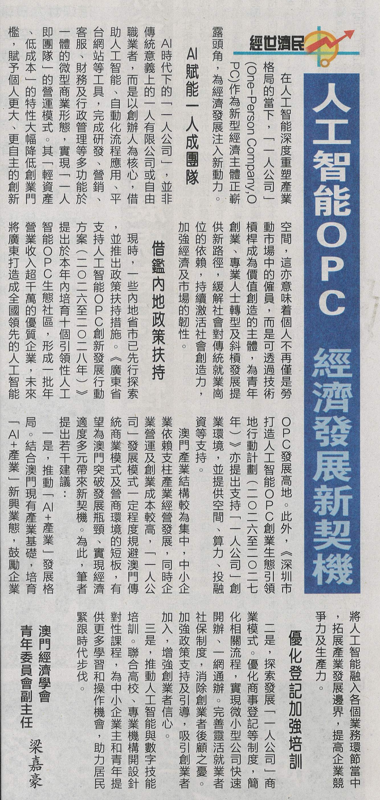| 人工智能OPC 經濟發展新契機 在人工智能深度重塑產業格局的當下,“一人公司”(One-Person Company,OPC)作為新型經濟主體正嶄露頭角,為經濟發展注入新動力。 AI賦能一人成團隊 AI時代下的“一人公司”,並非傳統意義上的一人有限公司或自由職業者,而是以創辦人為核心,借助人工智能、自動化流程應用、平台網站等工具,完成研發、營銷、客服、財務及行政管理等多功能於一體的微型商業形態,實現“一人即團隊”的營運模式。其“輕資產、低成本”的特性大幅降低創業門檻,賦予個人更大、更自主的創新空間,這亦意味着個人不再僅是勞動市場中的僱員,而是可透過技術槓桿成為價值創造的主體,為青年創業、專業人士轉型及斜槓發展提供新路徑,緩解社會對傳統就業崗位的依賴,持續激活社會創造力,加強經濟及市場的韌性。 借鑑內地政策扶持 現時,一些內地省市已先行探索,並推出政策扶持措施。《廣東省支持人工智能OPC創新發展行動方案(二○二六至二○二八年)》提出於本年內培育十個引領性人工智能OPC生態社區,形成一批年營業收入超千萬的優質企業,未來將廣東打造成全國領先的人工智能OPC發展高地。此外,《深圳市打造人工智能OPC創業生態引領地行動計劃(二○二六至二○二七年)》亦提出支持“一人公司”創業環境,並提供空間、算力、投融資等支持。 澳門產業結構較為集中,中小企業依賴支柱產業經營發展,同時企業營運及創業成本較高,“一人公司”發展模式一定程度規避澳門傳統商業模式及營商環境的短板,有望為澳門突破發展瓶頸、實現經濟適度多元帶來新契機。為此,筆者提出若干建議: 一是,推動“AI+產業”發展格局。結合澳門現有產業基礎,培育“AI+產業”新興業態,鼓勵企業將人工智能融入各個業務環節當中,拓展產業發展邊界,提高企業競爭力及生產力。 優化登記加強培訓 二是,探索發展“一人公司”商業模式。優化商事登記等制度,簡化相關流程,實現微小型公司快速開辦、一網通辦。完善靈活就業者社保制度,消除創業者後顧之憂。加強政策支持及引導,吸引創業者加入,增強創業者信心。 三是,推動人工智能與數字技能培訓。聯合高校、專業機構開設針對性課程,為中小企業主和青年提供更多學習和操作機會,助力居民緊跟時代步伐。 澳門經濟學會青年委員會副主任 梁嘉豪 新聞剪報詳閱: 澳門日報。 |