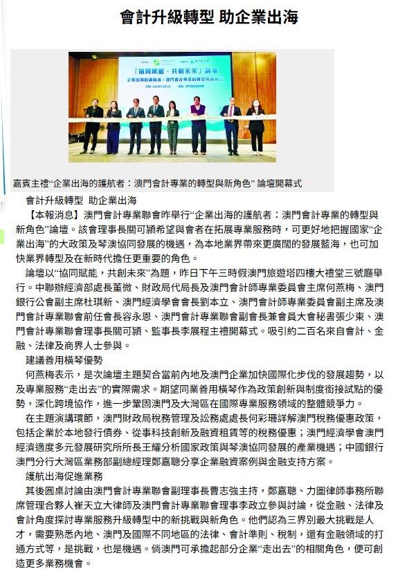 | 會計升級轉型 助企業出海 【本報消息】澳門會計專業聯會昨舉行“企業出海的護航者:澳門會計專業的轉型與新角色”論壇。該會理事長關可頴希望與會者在拓展專業服務時,可更好地把握國家“企業出海”的大政策及琴澳協同發展的機遇,為本地業界帶來更廣闊的發展藍海,也可加快業界轉型及在新時代擔任更重要的角色。 論壇以“協同賦能,共創未來”為題,昨日下午三時假澳門旅遊塔四樓大禮堂三號廳舉行。中聯辦經濟部處長董微、財政局代局長及澳門會計師專業委員會主席何燕梅、澳門銀行公會副主席杜琪新、澳門經濟學會會長劉本立、澳門會計師專業委員會副主席及澳門會計專業聯會前任會長容永恩、澳門會計專業聯會副會長兼會員大會秘書張少東、澳門會計專業聯會理事長關可頴、監事長李展程主禮開幕式。吸引約二百名來自會計、金融、法律及商界人士參與。 建議善用橫琴優勢 何燕梅表示,是次論壇主題契合當前內地及澳門企業加快國際化步伐的發展趨勢,以及專業服務“走出去”的實際需求。期望同業善用橫琴作為政策創新與制度銜接試點的優勢,深化跨境協作,進一步鞏固澳門及大灣區在國際專業服務領域的整體競爭力。 在主題演講環節,澳門財政局稅務管理及訟務處處長何彩珊詳解澳門稅務優惠政策,包括企業於本地發行債券、從事科技創新及融資租賃等的稅務優惠;澳門經濟學會澳門經濟適度多元發展研究所所長王耀分析國家政策與琴澳協同發展的產業機遇;中國銀行澳門分行大灣區業務部副總經理鄭嘉聰分享企業融資案例與金融支持方案。 護航出海促進業務 其後圓桌討論由澳門會計專業聯會副理事長曹志強主持,鄭嘉聰、力圖律師事務所聯席管理合夥人崔天立大律師及澳門會計專業聯會理事李政立參與討論,從金融、法律及會計角度探討專業服務升級轉型中的新挑戰與新角色。他們認為三界別最大挑戰是人才,需要熟悉內地、澳門及國際不同地區的法律、會計準則、稅制,還有金融領域的打通方式等,是挑戰,也是機遇。倘澳門可承擔起部分企業“走出去”的相關角色,便可創造更多業務機會。 詳閱: 澳門日報A14。 |