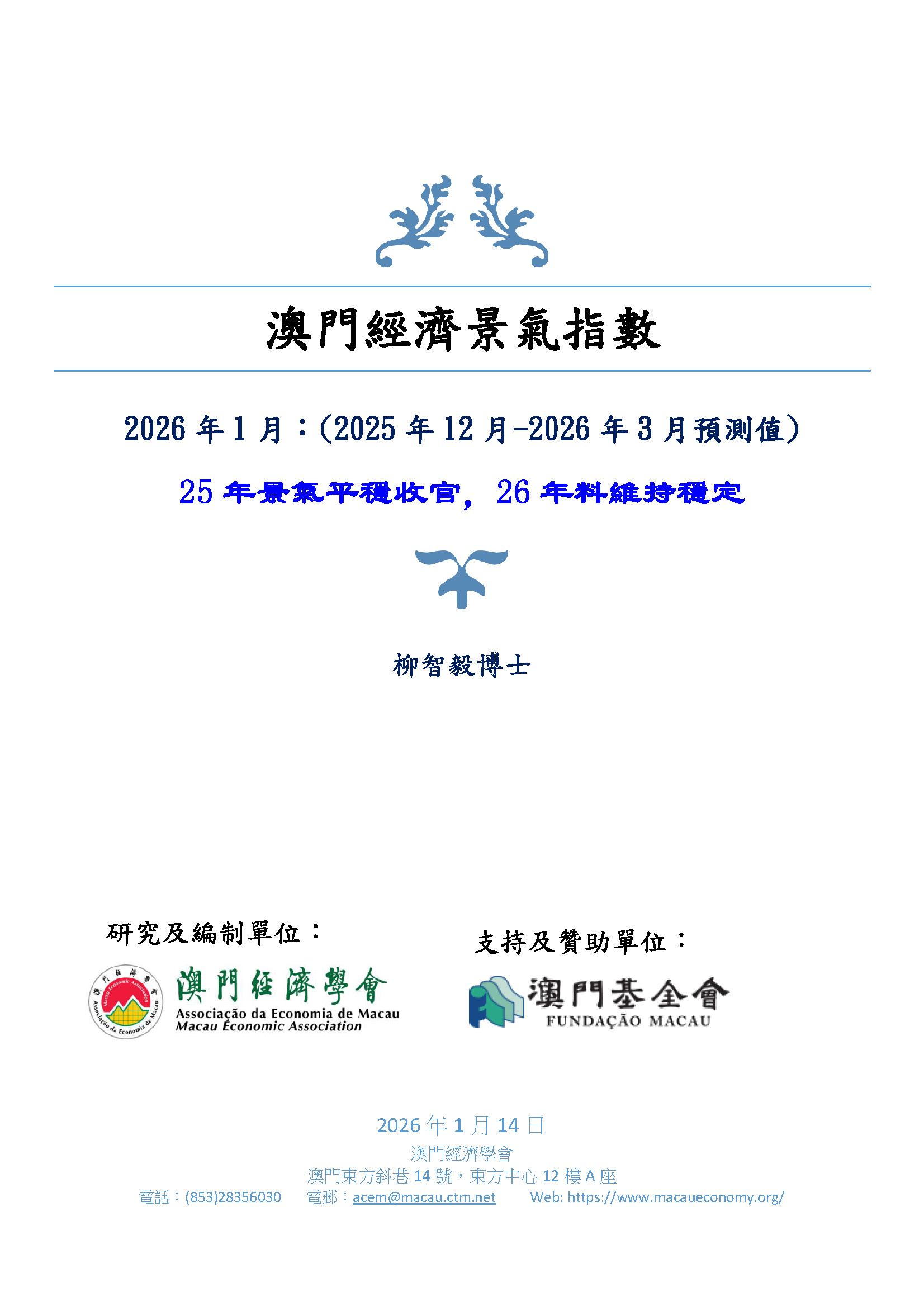 | 澳門經濟學會發佈最新澳門經濟景氣指數走勢。 經濟景氣去年末平穩收官 2025年最後兩個月收官階段整體運行平穩。博彩業收入延續按年增長走勢,惟十二月較十一月略有回調,最後兩個月日均博彩毛收入分別為7.03億及6.74億澳門元,反映增長動力或轉趨溫和。2025年全年接待遊客達4,006萬人次,超越 2019年疫情前峰值,並創下歷史新高,較 2024 年增長 14.7%。旅遊及相關指標持續活躍,入境旅客人次、酒店住客量與平均入住率均維持在“偏熱”至“過熱”水平。人力資源市場表現穩健,整體失業率維持在1.7%的低位,反映勞動力需求仍然較為殷切。 然而,外部環境的不確定性、消費模式的轉變、經濟發展的不平衡等問題並存的情況下,中小企業經營壓力與居民收入增長乏力,企業與家庭於消費及投資決策上或更趨保守。內地消費者信心指數較長時間處於“低迷”區間。資本市場方面,六大綜合度假休企股價仍於“欠佳”區間徘徊,反映投資者對中期經濟前景態度審慎。本地居民貸存比維持較低水平,住宅樓價指數亦持續低迷。經綜合多項經濟指標的分析研判和推算,十一月至十二月經濟景氣指數分別為6.3分及6.2分。 料首季綜合旅遊休閒基礎穩固,但整體節奏或趨緩 展望2026年,“穩中向好”的支撐條件和基本趨勢沒有變,澳門經濟仍將以綜合旅遊休閒業作為主要引擎帶動,並料隨着2026年相關的施政方針有效貫徹落實,本澳休閒旅遊的市場推廣活動的增加,休閒旅遊產品不斷的豐富,以及訪澳旅客更趨多元化等因素帶來的支持,綜合旅遊休閒業將維持較強韌性,持續推動整體增長。即將到來的春節及其他節假日帶來的客流高峰,將對入境旅客人次、酒店入住率以及博彩毛收入形成直接支撐,帶動整體景氣基礎進一步穩固。然而,隨着經濟社會轉變,整體發展不平衡,社區經營環境面臨深刻複雜變化,整體經濟呈現“冷暖並存”,民生區中小微企業經營壓力仍然突出。經綜合研判和推算,預料今年第一季本澳經濟景氣指數將維持於6.1分至6.3分區間,整體景氣表現可望持續呈現“持續平穩”態勢。 圖:過去一年經濟景氣指數走勢及近期預測值(十三項指標) 新聞剪報